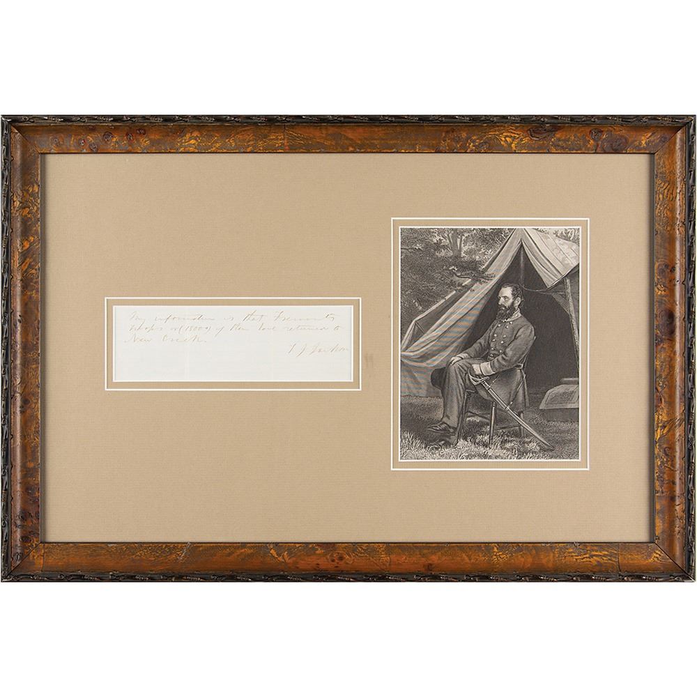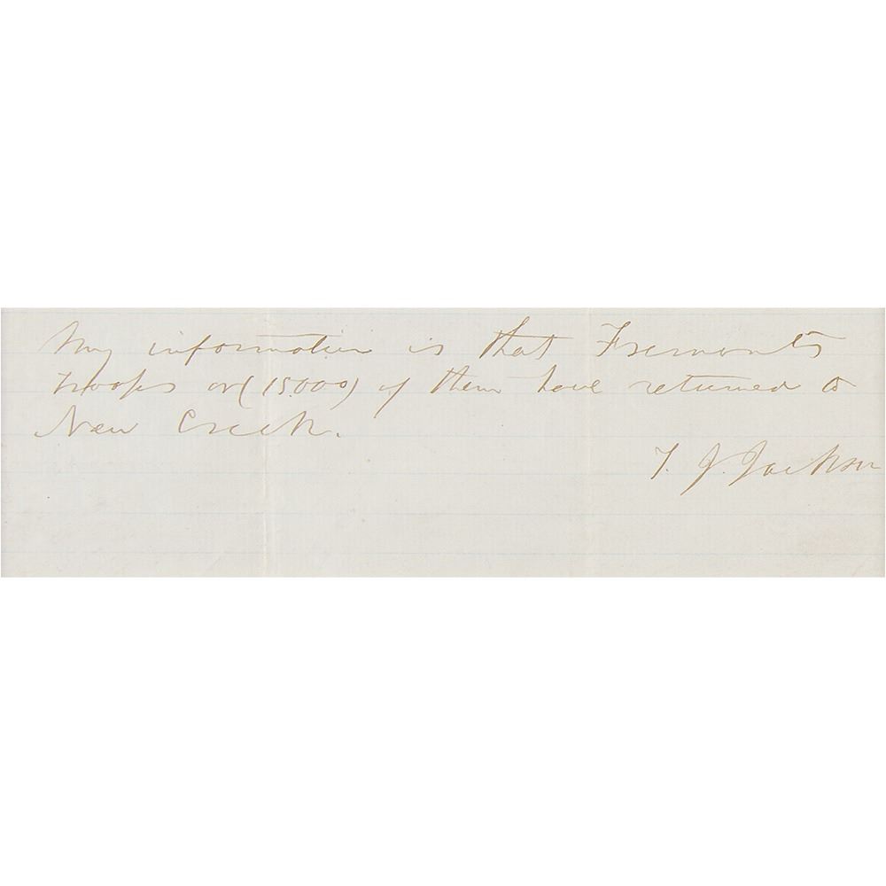 Civil War-era ANS signed “T. J. Jackson,†one page, 7.25 x 2.25, no date (circa May / June 1862). Brief handwritten note to an unidentified recipient: "My information is that Fremonts troops or (15000) of them have returned to New Creek." Handsomely double-matted and framed with an engraved portrait to an overall size of 21 x 14.25. In fine condition. The consignor notes that another hand has on the reverse written: "This was given me by Col. A. W. Harman—Adjt. Gen. on 'Stonewall Jackson's' Staff & the attached P.S. was to him personally, Staunton, Va., Sepr. 1882."