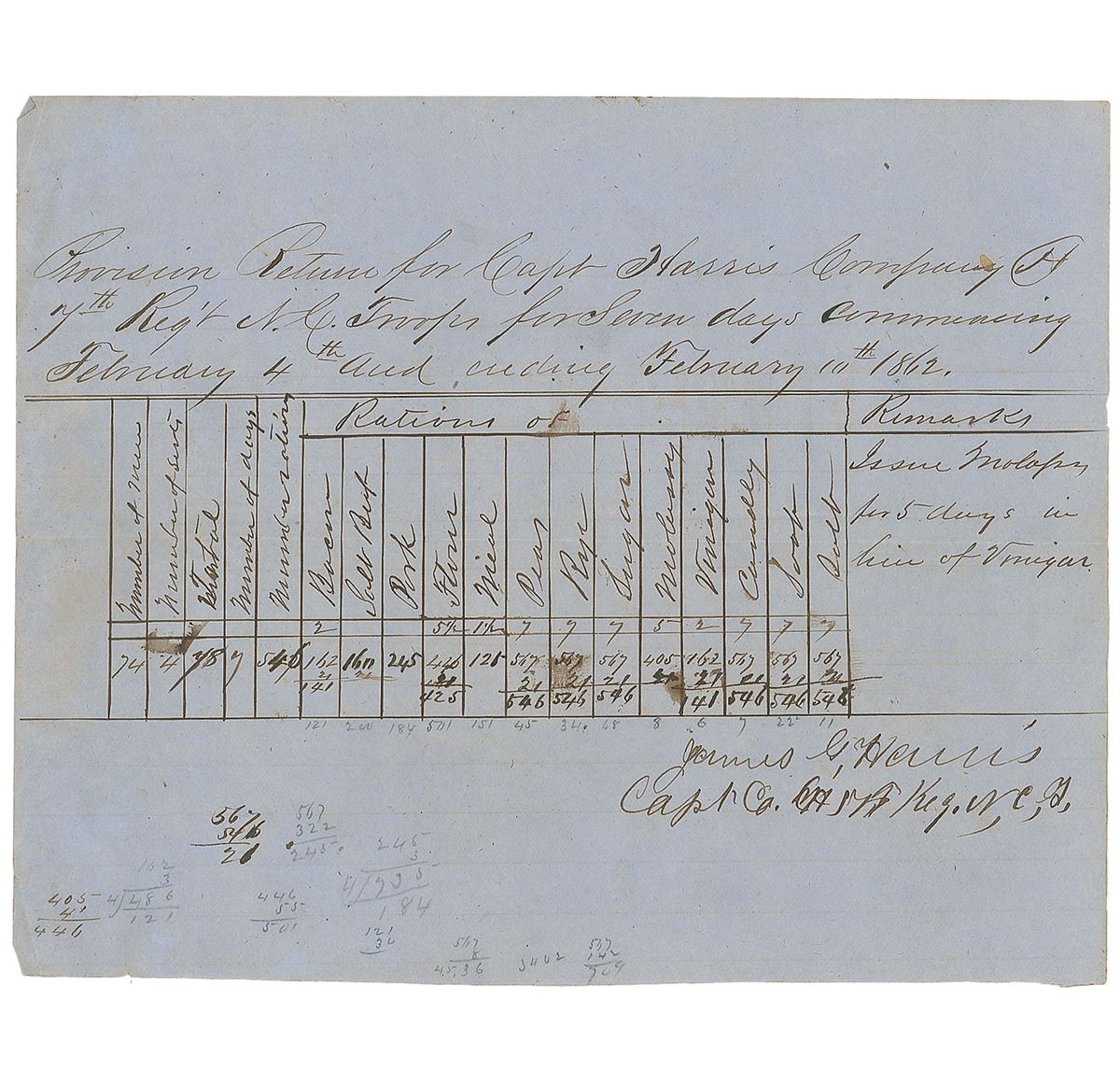 Confederate captain whose brigade mistook Stonewall Jackson and his staff for Union troops and fired at them, fatally wounding Jackson. Manuscript DS, signed “James G. Harris,” one page, 7.25 x 6, February 10, 1862. A document headed, “Provision Return for Capt. Harris…7th Reg’t N. C. Troops for Seven days commencing February 4th and ending February 10th 1862.” The form lists rations for several different types of food, including bacon, pork, flour, sugar, and vinegar. Expected document wear and scattered soiling, otherwise fine condition.