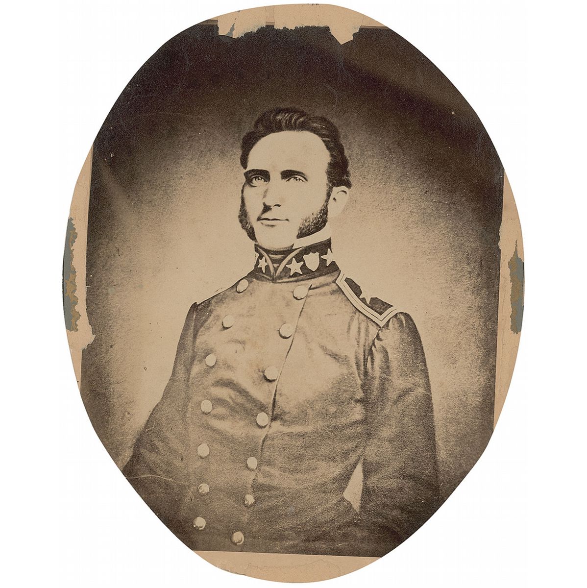 Large oval albumen photograph of Jackson, 7 x 9, reproducing a painting of the general in uniform. Affixed to its original thin cardboard backing, hand cut and trimmed to an overall size of 8 x 10. Shows paper loss and added paper to the edges, otherwise light wear. Interesting due to its unusually large size.