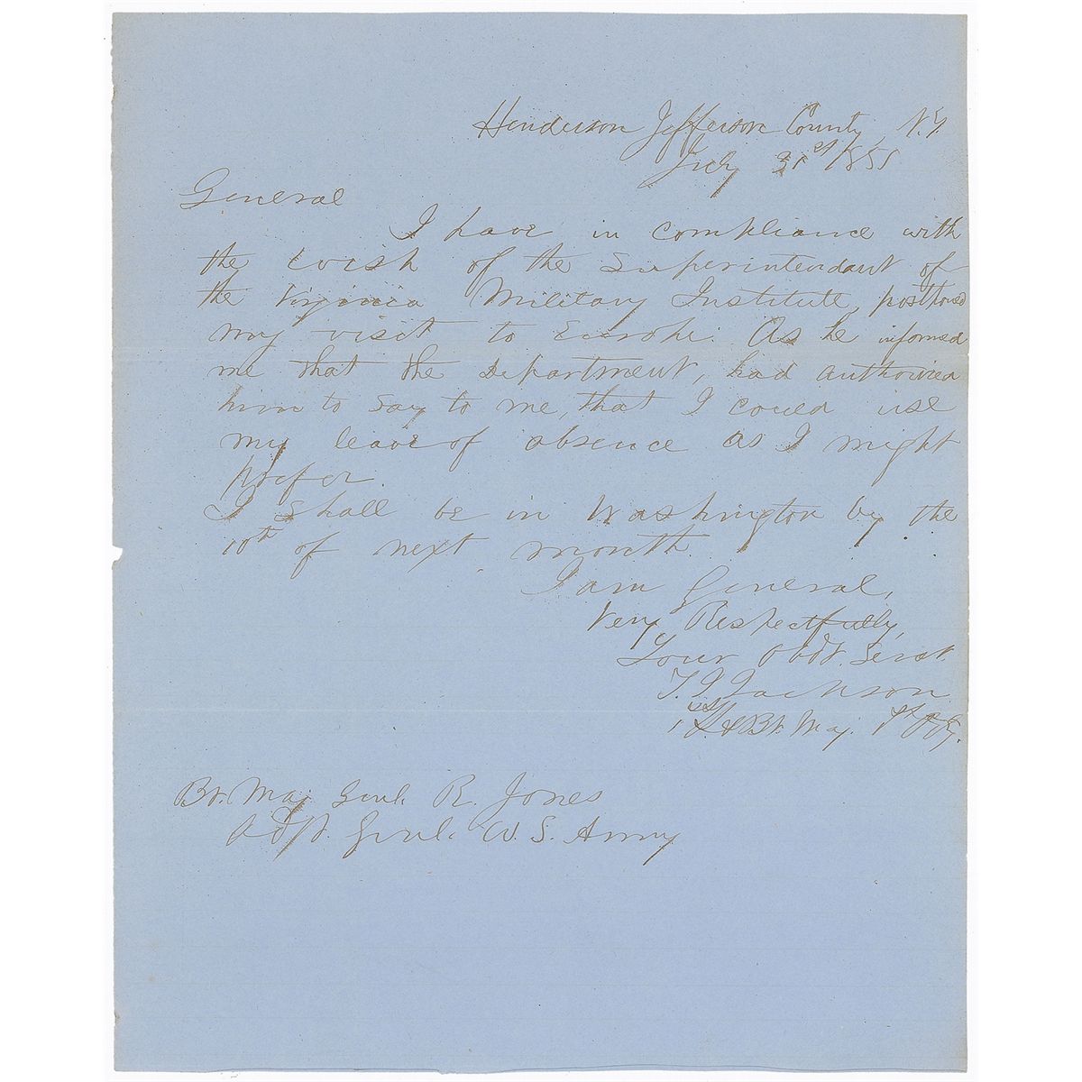 Scarce ALS signed “T. J. Jackson, Bvt. Maj. Infty,” one lightly-lined light blue page, 8 x 9.75, July 31, 1851. Jackson, then on vacation in upstate New York, writes to General R. Jones. In full: “I have in compliance with the wish of the Superintendent of the Virginia Military Institute postponed my visit to Europe. As he informed me that the Department has authorised him to say to me, that I could use my leave of absence as I might prefer. I shall be in Washington by the 10th of next month.” In fine, clean condition, with horizontal mailing fold passing through rank beneath signature, some wrinkling along the upper horizontal fold, and a tiny chip to left edge affecting nothing. Jackson was in upstate New York at the time seeking treatment for a chronic stomach ailment by a physician whom he had recently met. The physician, Lowery Barney, changed his diet and placed him on an exercise regimen. Barney also introduced Jackson to hydropathy, which used only cold water as a medical treatment. Incidentally, as referenced in this letter, Jackson did eventually join VMI as a member of its faculty, where he was an unpopular teacher whose methods were said to lack originality.