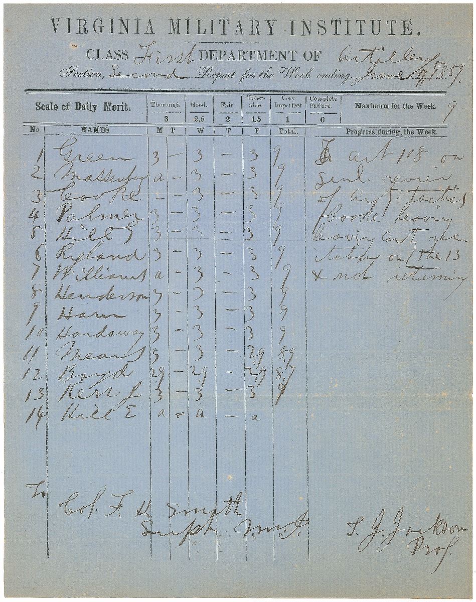 Partly-printed ADS, filled out entirely in Jackson’s hand and signed “T. J. Jackson, Prof.,” one page, 7.75 x 10, June 17, 1859. A Virginia Military Institute weekly grading report for his class in the Department of Artillery. Jackson writes down the names of the cadets in the first column and gives most of them a “9,” the highest grade. His students include: "Green," "Massenburg," "Cooke," "Palmer," "Hill G," "Ryland," "Williams," "Henderson," "Ham," "Hardaway," "Mears," "Boyd," "Kerr J," and "Hill E." In his notes on progress during the week, Jackson writes: “On genl. review of Arty tactics Cooke leaving leaving [sic] Arty recitation on the 13 & not returning.” At the bottom, he addresses the report to: “To Col. F. H. Smith, Supt V.M.I.” Jackson also dockets the reverse: “Weekly class report, June 17th 1859, 2d Sec., 1st Class, Artillery.” In fine condition. Accompanied by an unsigned carte-de-visite portrait.