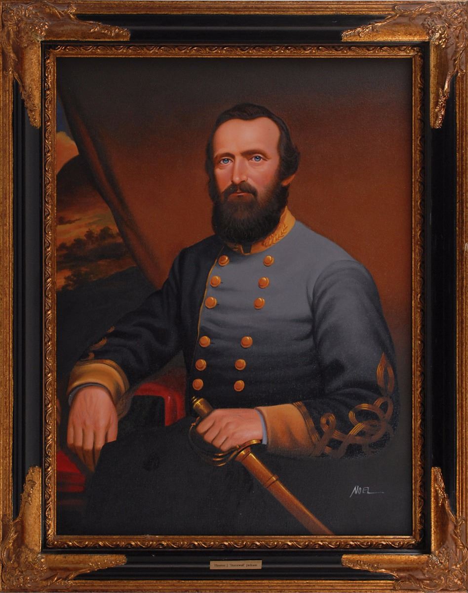 Excellent original painting of Stonewall Jackson, oil on canvas, 17.5 x 23.75, showing the Confederate general in a noble half-length pose, signed in the lower right by the artist, “Noel.” Elaborately framed to an overall size of 23.25 x 29.25. In fine condition.
