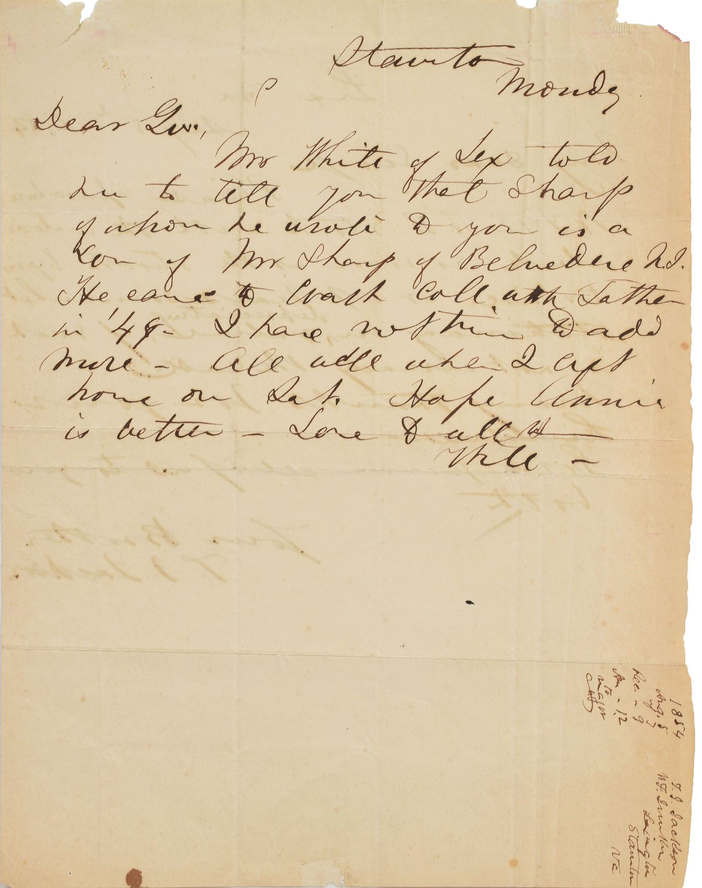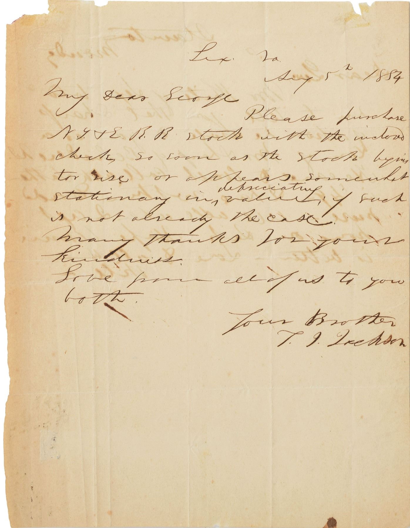 Rare ALS signed “T. J. Jackson,” one page, 6.5 x 8.5, August 5, 1854. Written from Lexington, Virginia, a letter to his brother George, in full: "Please purchase N. Y. & E. R. R. stock with the inclosed check, so soon as the stock begins to rise or appears somewhat stationary in depreciating value; if such is not already the case. Many thanks for your kindness. Love from all of us to you both." In very good to fine condition, with intersecting folds, chipping to the top edge, and writing showing through from a letter to Jackson on the reverse. Accompanied by an engraving bearing a preprinted signature.