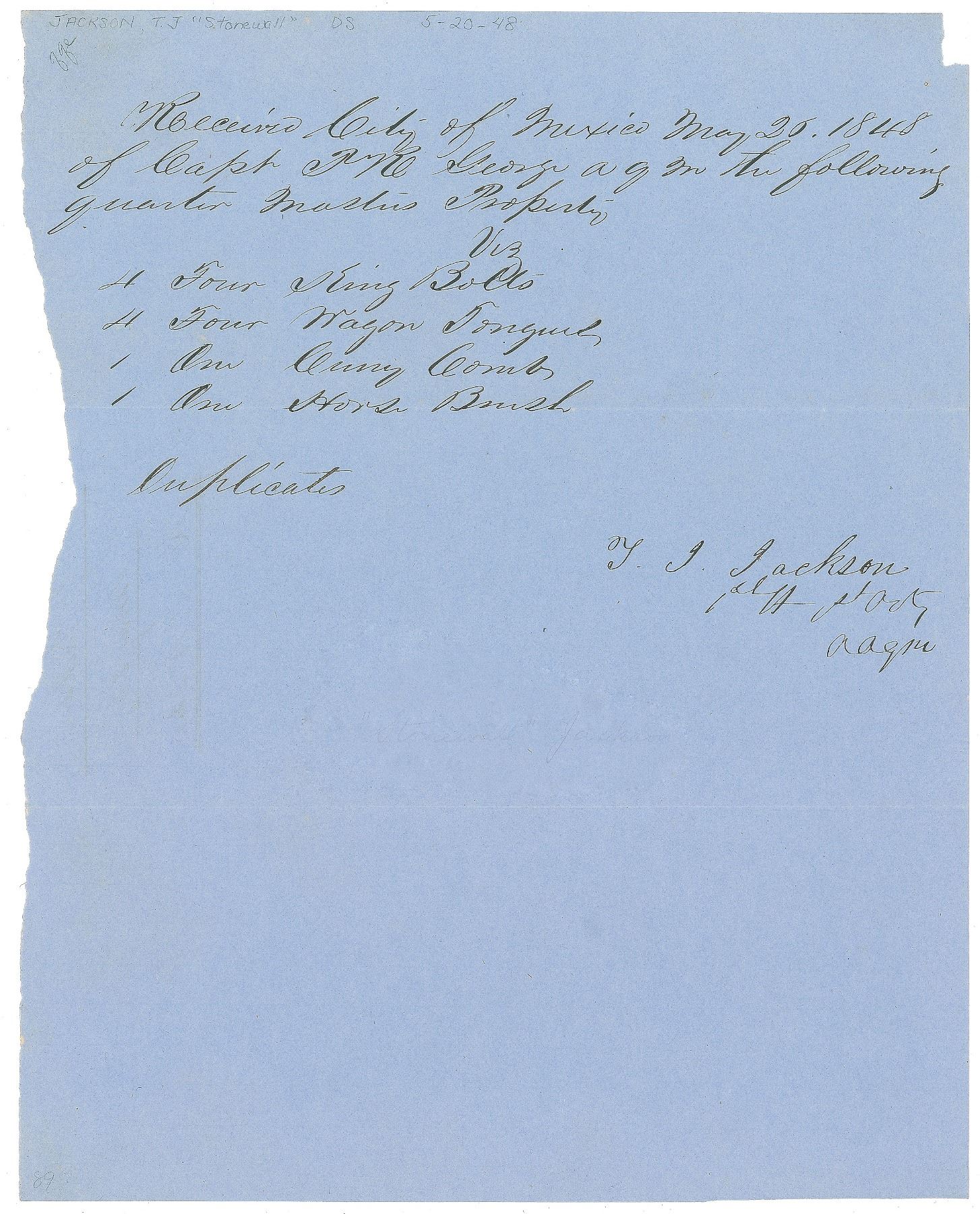 Manuscript DS, signed "T. J. Jackson, 1st Lt. 1st Arty, AAQM," one page, 7.75 x 9.75, May 20, 1848. Jackson, stationed in Mexico City, confirms receipt of "the following quarter master's Property: 4 Four King Bolts, 4 Four Wagon Tongues, 1 One Curry Comb, 1 One Horse Brush." In fine condition, with paper loss to left edge and top right corner affecting nothing. Interestingly, it was during this time in Mexico that Jackson first met Robert E. Lee. Boasting a supremely crisp signature as well as desirable equine content—the comb and brush being specialized horse grooming implements—this is an especially appealing piece.