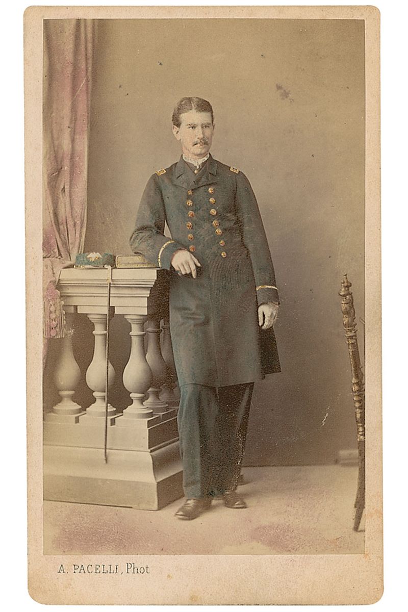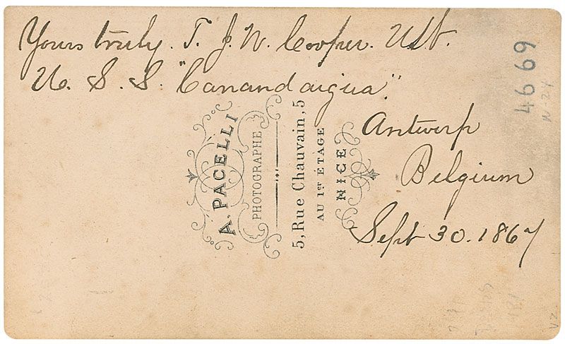 Union naval officer who served as an engineer on the USS Canandaigua. Original 2.5 x 4 carte-de-visite full-length hand-colored portrait of Cooper in uniform by A. Pacelli of Nice, signed on the reverse in black ink, “Yours truly, T. J. W. Cooper, USN, U. S. S. ‘Canandaigua,’ Antwerp, Belgium, Sept. 30, 1864.” In fine condition, with light scattered marks and soiling.