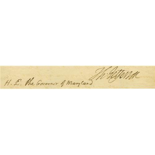 <B>Thomas Jefferson Historically Important Autograph Letter Signed</B></I>: Just a month after George Washington's "Proclamation of Neutrality," the Secretary of State tells the Governor of Maryland that he has shown his letter to President Washington and that those citizens who aided French Charge d'Affaires Citizen Genet in the capture of the British ship now in a Maryland port would be prosecuted.<BR><BR>Signed: "<I>Th.Jefferson</B></I>" as Washington's Secretary of State, one page, 7.5" x 9.25". Philadelphia, May 25, 1793. To "<I>H</B></I> is . <I>E</B></I> xcellency . <I>The Governor of Maryland</B></I>" Thomas Sim Lee . In full: "<I>Sir, I am honoured with your Excellency's letter of the 20th and have duly laid the same before the President. measures had been already taken for prosecuting such American citizens as had joined in the capture therein mentioned, a letter to that effect having been written to the Attorney of the U.S. in the state of Maryland. with respect to the prize, the government did not think itself authorized to do anything. your Excellency will have been informed by a letter from the Secretary at war, addressed to you as the head of the militia of your state, of the measures proposed for preventing the fitting out privateers in our ports in future, as well as for the preservation of peace within our limits. I have the honour to be with great respect & esteem, your Excellency's most obedt & most humble svnt.</B></I>" With a printed photograph of Citizen Genet.<BR><BR>Thomas Jefferson, author of the Declaration of Independence, was Washington's first Secretary of State, entering his duties on March 22, 1790, after returning from France where he had been U.S. Minister since 1785. He served until December 31, 1793. In April, 1793, before Washington's "Proclamation of Neutrality," Jefferson urged that the United States maintain its alliance with France in the European wars, but his position changed after the "Genet Affair."<BR><BR><B>Citizen Edmond C. Genet</B></I> (1763-1834) was named Charge d'Affaires to the United States in 1793 by the French government to gain support for France's war with England and Spain. He arrived in Charleston, South Carolina, on April 8, 1793, and began commissioning privateers to capture British vessels of commerce and bring them into U.S. ports. There was much anti-British and pro-French sentiment by Americans Genet met in Charleston and as he rode to Philadelphia to take his post.<BR><BR>In April, 1793, news had reached the United States that King Louis XVI had been guillotined and that France had declared war on England and Spain. Reacting to these events, on April 22, 1793, President Washington issued what has become known as the <B>"Proclamation of Neutrality"</B></I> which stated that "Whereas it appears that a state of war exists between Austria, Prussia, Sardinia, Great Britain, and the United Netherlands, of the one part, and France on the other; and the duty and interest of the United States require that they should with sincerity and good faith adopt and pursue a conduct friendly and impartial toward the belligerent Powers; I have therefore thought fit by these presents…to exhort and warn the citizens of the United States carefully to avoid all acts and proceedings whatsoever, which may in any manner tend to contravene such disposition. And I do hereby also make known, that whatsoever of the citizens of the United States shall render himself liable to punishment or forfeiture under the law of nations, by committing, aiding, or abetting hostilities against any of the said Powers…will not receive the protection of the United States, against such punishment or forfeiture; and further, that I have given instructions to those officers, to whom it belongs, to cause prosecutions to be instituted against all persons, who shall, within the cognizance of the courts of the United States, violate the law of nations, with respect to the Powers at war, or any of them."<BR><BR><B>Maryland Governor Thomas Sim Lee</B></I> (1745-1819) wrote to Secretary of State Jefferson on May 20, 1793. Genet's privateers had captured a British vessel and had harbored it in Maryland. The British consul had sought Governor Lee's protection for the ship. Lee wrote Jefferson, in part, "We have acquainted the consul with our incompetency…to interfere, even supposing the capture to be illegal…and have advised him that it can only be obtained from the general government." Lee served twice as Governor of Maryland (1779-1783, 1792-1794) and was a Member of the Continental Congress in 1783.<BR><BR>This letter is Jefferson's reply, informing Lee that he has shown his letter to President Washington. Jefferson tells Lee that the U.S. Attorney in Maryland had been notified and that American citizens who were involved in the capture would be prosecuted. This action had been legalized by Washington's April 22nd "Proclamation of Neutrality." Jefferson informs Lee that the federal government wasn't authorized to do anything respecting the prize, the ship's cargo seized by the privateer. Jefferson also advises Lee that the Secretary of War (Henry Knox) will write him what he can do, as head of the state militia, to prevent privateers from being fitted for action in American ports in the future, inferring that it's the state's responsibility, not the federal government's. In August, 1793, after Genet's continued actions in defiance of the U.S. government, Washington asked France to recall Genet. Realizing that he faced the guillotine if he returned to France, Genet asked if he could remain in the United States and Washington granted his request for political asylum. Genet later became an American citizen.<BR><BR>The "Genet Affair" was the first test of America's national foreign policy and the execution of the "separation of powers" principles of the U.S. Constitution. In this letter, Thomas Jefferson writes of the federal prosecution of American citizens involved in the