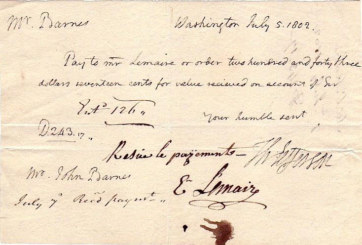 Thomas Jefferson signed autograph letter ''Th. Jefferson” as President, to John Barnes, Washington, 5 July 1802. Jefferson writes a note to Barnes, regarding his personal expenses as President. Note was hand-carried by Etienne Lemaire, Maitre d’hotel of the Executive Mansion. Jefferson asks for money so Lemaire can cover expenses: “Pay to Mr. Lemaire or order two hundred and forty three dollars seventeen cents for value received on account of sir…Your humble servt.” Also signed in French by Lemaire confirming he had received the money. Single page, oblong measuring 7.25'' x 4.5'' in fine condition.