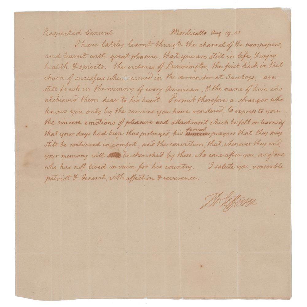 Superlative ALS as president, signed “Th: Jefferson,†one page, 7.75 x 8, August 19, 1805. Handwritten letter from Monticello to General John Stark, in full: "I have lately learnt through the channel of the newspapers, and learnt with great pleasure, that you are still in life, & enjoy health & spirits. The victories of Bennington, the first link in that chain of successes which issued in the surrender at Saratoga, are still fresh in the memory of every American, & the name of him who atchieved [sic] them dear to his heart. Permit therefore a stranger who knows you only by the services you have rendered, to express to you the sincere emotions of pleasure and attachment which he felt on learning that your days had been thus prolonged, his fervent prayers that they may still be continued in comfort, and the conviction, that, whenever they end, your memory will be cherished by those who come after you, as of one who has not lived in vain for his country. I salute you, venerable patriot & General, with affection & reverence." Addressed on the integral leaf in Jefferson's hand to "General Starke, Derryfield." In fine condition, with trimmed edges, and complete silking to the reverse. Accompanied by an engraved portrait bearing a facsimile signature.