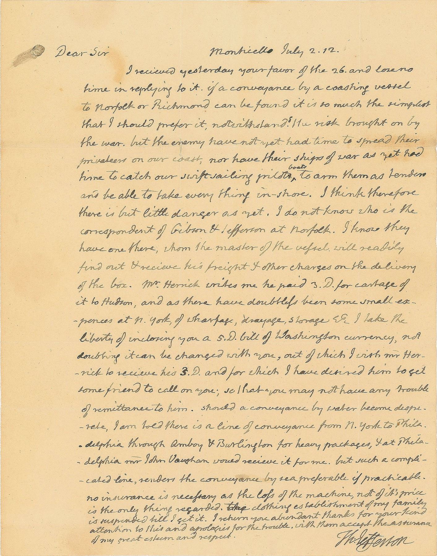 War-dated ALS signed “Th: Jefferson,” one page, 7.75 x 9.75, July 2, 1812. Written from Monticello, a letter to David Gelston, in part (grammar and spelling retained): “I received yesterday your favor of the 26. and lose no time in replying to it. if a conveyance by a coasting vessel to Norfolk or Richmond can be found it is so much the simplest that I should prefer it, notwithstand’g the risk brought on by the war. but the enemy have not yet had time to spread their privateers on our coast, nor have their ships of war as yet had time to catch our swift sailing…boats to arm them as London and be able to take every thing in-shore. I think therefore there is but little danger as yet. I do not know who is the correspondent of Gibson & Jefferson at Norfolk. I know they have one there, whom the master of the vessel will readily find out & receive his freight & other charges on the delivery of the box. Mr. Herrick writes me he paid 3. D. for cartage of it to Hudson, and as there have doubtless been some small expences at N. York, of wharfage, drayage, storage etc. I take the liberty of inclosing you a 5. D. bill of Washington currency, not doubting it can be changed with you, out of which I wish Mr. Herrick to receive his 3. D. and for which I have desired him to get some friend to call on you; so that you may not have any trouble of remittance to him. should a conveyance by water become desperate, I am told there is a line of conveyance from N. York to Philadelphia through Amboy & Burlington for heavy packages, & at Philadelphia mr John Vaughan would receive it for me. but such a complicated line, renders the conveyance by sea preferable if practicable. no insurance is necessary as the loss of the machine, not of it’s price is the only thing regarded. the clothing establishment of my family is suspended till I get it. I return you abundant thanks for your kind attention to this and apologies for the trouble.” In fine condition, with a few light stains.