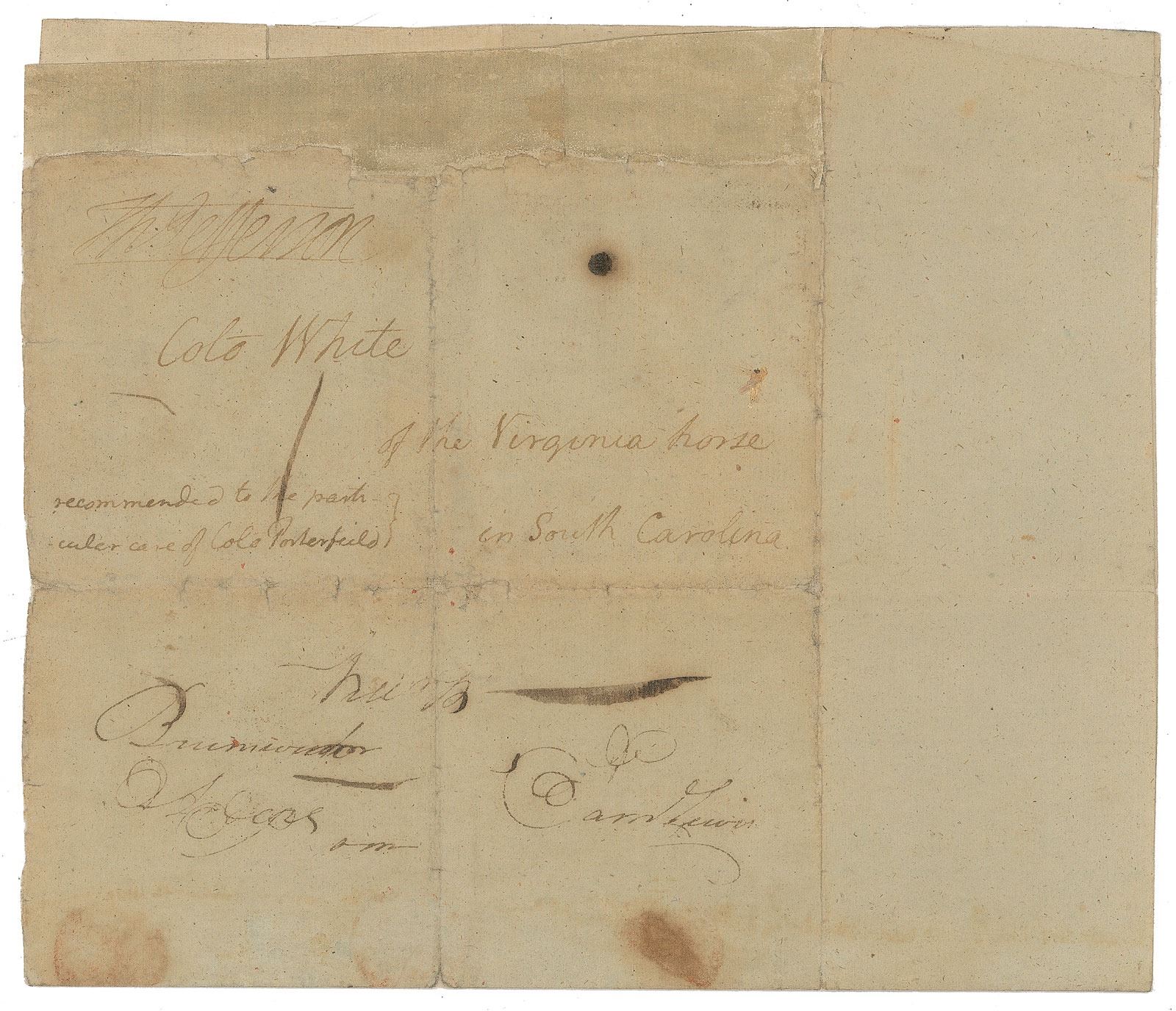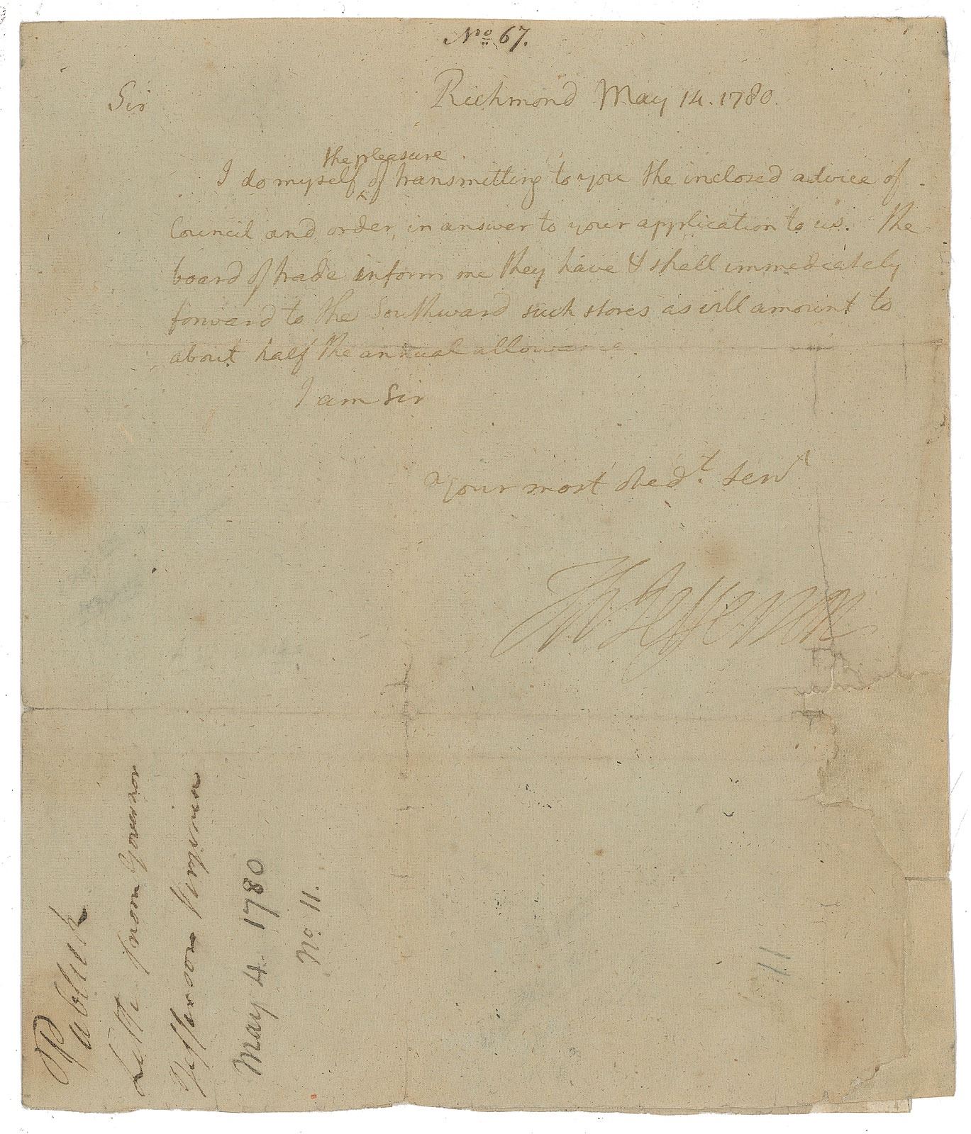 Revolutionary War-dated twice-signed ALS as governor, signed “Th: Jefferson,” one page, 7.5 x 8.75, May 14, 1780. Letter to Colonel Anthony Walton White, "of the Virginia horse in South Carolina," in full: "I do myself the pleasure of transmitting to you the inclosed advice of Council and order in answer to your application to us. The board of trade inform me they have & shall immediately forward to the Southward such stores as will amount to about half the annual allowance." Jefferson addresses the reverse of the second integral page and adds his signature to the upper left. In very good condition, with trimmed bottom edge, a few light stains, tears to the right side repaired via overall silking, and all of the handwriting several shades light.