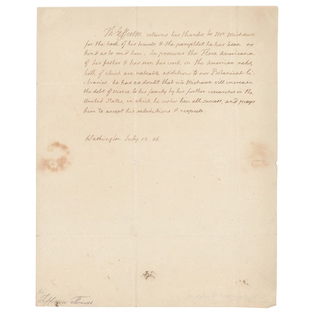 Third-person ALS as president, signed “Th: Jefferson,” one page, 7.75 x 9.75, July 12, 1806. Letter to botanist Francois Andre Michaux, in full: "Th: Jefferson returns his thanks to Mr. Michaux for the book of his travels & the pamphlet he has been so kind as to send him. He possesses the Flora Americana of his father & has seen his work on the American oaks, both of which are valuable additions to our Botanical libraries. He has no doubt that Mr. Michaux will increase the debt of science to his family by his further researches in the United States, in which he wishes him all success, and prays him to accept his salutations & respects." In fine condition, with intersecting folds, a crease to the upper right corner tip, and two light seal-related stains.