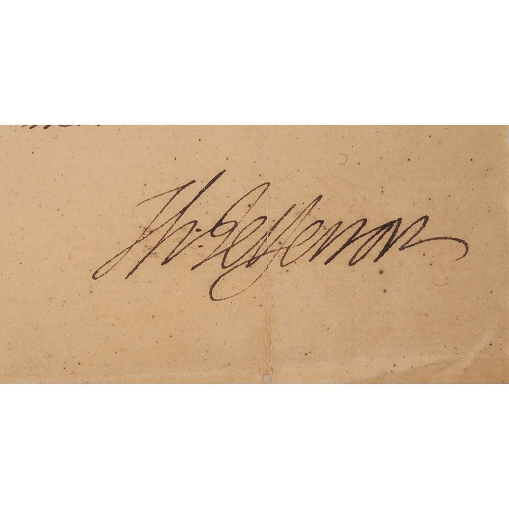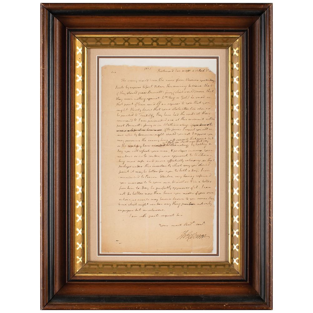 Revolutionary War-dated ALS as Governor of Virginia, signed "Th: Jefferson," one page, 8 x 12.75, January 11, 1781. Addressed from Richmond, a handwritten letter to Brigadier General George Weedon, in full: "The enemy moved down the river from Westover yesterday. I wrote by express to Genl. Nelson this morning to desire that if they should pass Burwell's ferry (which would prove that they mean nothing against Wms'burg or York) he would in that point of time send off an express to you that you might thereby know that your whole attention should be pointed to Fredsbg. They have had the winds at their command and I am persuaded are at this moment either past Burwell's ferry or in Williamsburg. If the former I expect you will receive notice by tomorrow night. Should you not I suppose you may presume the enemy have not passed that point but on the contrary have invaded Williamsburg and that you should move that way. By halting a day you will refresh your men, and perhaps increase your numbers so as to render your approach to Williamsburg more safe and more effectually relieving. So that perhaps under this incertainty which way you should point it may be better for you to halt a day. I communicated to Baron Steuben my having referred your movements to your own discretion and in a letter from him to-day he perfectly approves of it. I cannot do better now than leave you master of your own actions, as events may become known to you sooner than to me which might render any thing positive not only proper but mischievous." Double-matted and framed to an overall size of 15.25 x 20.25. In fine condition, with slightly rough edges, and a missing upper right corner tip affecting one word of that date.
