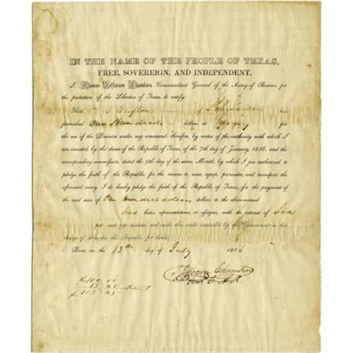 <B>Thomas Jefferson Chambers Document Signed</B></I>: "<I>T. Jefferson Chambers/Genl C.A.R.</B></I>," one page, 8" x 9.75". [Kentucky], July 13, 1836. Partly printed, completed in manuscript. Headed: "<I>In the Name of the People of Texas, Free, Sovereign, and Independent.</B></I>" In part, "<I>I, Thomas Jefferson Chambers, Commandant General of the Army of Reserve, for the protection of the Liberties of Texas, do certify that Wm. B. Clifton of Louisville has furnished One Hundred dollars in Money for the use of the Division under my command; therefore by virtue of the authority with which I am invested, by the decree of the Republic of Texas, of the 7th day of January, 1836...do hereby pledge the faith of the Republic of Texas, for the payment of the said sum...with an interest of Six per cent per annum...</B></I>" Calculations in the lower left indicate that $15.45 interest was added to the $100 when the money was repaid. He had worked with the Mexican Government as a state attorney, but in January 1836, he asked the General Council of Texas for the rank of major general in return for raising and equipping 1,145 volunteers, the "Army of Reserve," in the United States to be marched to Texas by May 15, 1836. He intended to use his own credit in the amount of $10,000, which would be repaid by Texas. He left for Kentucky on February 23rd. Though he did not return until June 1837, he sent troops to Texas after the battle of San Jacinto in April. William B. Clifton was one of those soldiers. On verso of the document is "<I>Pay to A T Burnley order-/W.B. Clifton</B></I>" which shows through on front. Chambers' claim of sending 1,915 men to Texas is disputed. His accounts totaling $23,621 were approved, but they were not paid because there was no money in the treasury. For service as major general, he applied for a bounty of 1,280 acres which he received in 1846. Tape affixed on verso to strengthen the folds shows through on front. The letter is lightly soiled in areas and mildly wrinkled. Overall, in fine condition. <I>From the collection of Darrel Brown.</B></I><BR><BR><I>Ex: Library of Ford Mitchell</B></I><BR><BR><b>Shipping:</b> Flat Material, Small (<a target="_blank" href="http://www.heritageauctions.com/common/shipping.php">view shipping information</a>)