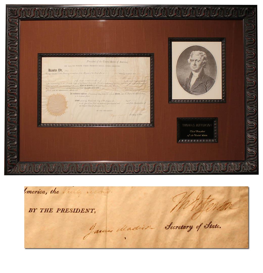 Thomas Jefferson land grant signed as President, dated 7 June 1808. Here, Jefferson appoints a quarter lot of land in Cincinnati to Joseph Gripe. Reads in part, ''…Having deposited in the Treasury a certificate of the Register of the Land office at Cincinnati where it appears that full payment has been made for the fourth east quarter of lot…of township number five, in range number Four (East of a meridian line drawn from the…great Miami River) of the Lands directed to be sold at Cincinnati…'' The document is signed ''Th. Jefferson'' at conclusion and is also signed by Secretary of State James Madison. Ornate wood frame with complementing maroon fabric mat measures 32'' x 21.5''. Letter, measuring 13.5'' x 8.25'', is in very good condition with wrinkling and folds. Original U.S. seal at lower left corner.