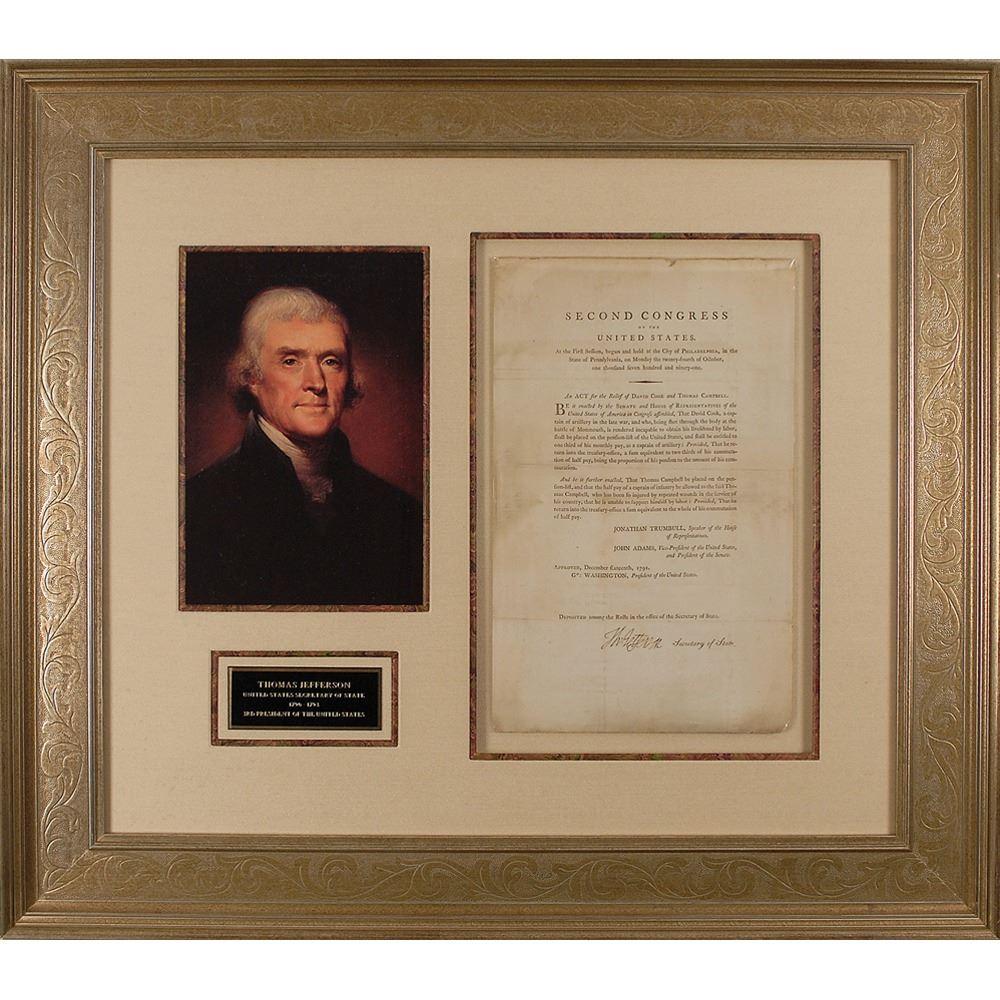 DS, signed "Th: Jefferson," one page, 8 x 13, December 16, 1791. An Act of the Second Congress, in part: "An Act for the relief of David Cook and Thomas Campbell. Be it enacted by the Senate and House of Representatives of the United States of America in Congress assembled, That David Cook, a captain of artillery in the late war, and who, being shot through the body at the battle of Monmouth, is rendered incapable to obtain his livelihood by labor, shall be placed on the pension-list of the United States, and shall be entitled to one third of his monthly pay, as a captain of artillery…Thomas Campbell [shall] be placed on the pension-list, and…the half pay of a captain of infantry be allowed to the said Thomas Campbell, who has been so injured by repeated wounds in the service of his country, that he is unable to support himself by labor." Signed at the conclusion by Jefferson as Secretary of State, with typed signatures of George Washington, John Adams, and Jonathan Trumbull also present. Elegantly double-cloth-matted and archivally framed with a color portrait of Jefferson and a small plaque to an overall size of 27.25 x 24.25. In fine condition, with light soiling, minor corner loss, and indications of being mounted to a same-size sheet (not examined out of the frame).