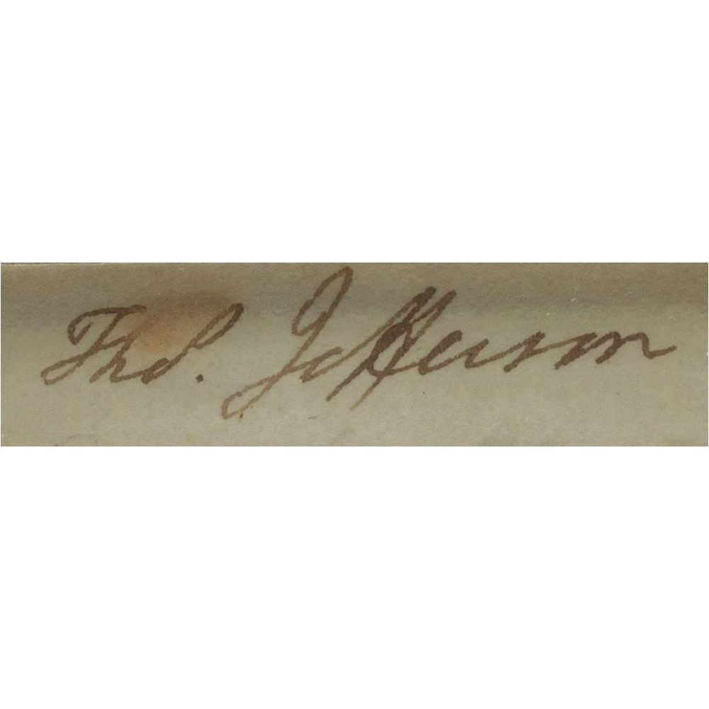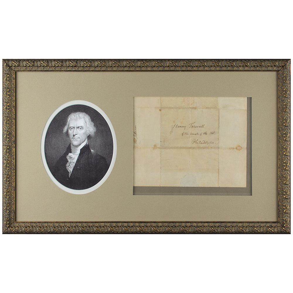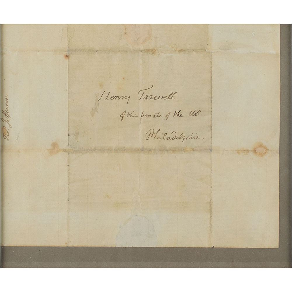Hand-addressed mailing panel circa 1794–1799, measuring 9 x 7 open with a central panel of 4.5 x 3, addressed by Thomas Jefferson to "Henry Tazewell of the Senate of the US, Philadelphia." Docketed in another hand with Jefferson's name along the left edge. Matted and framed with a portrait to an overall size of 22.5 x 13.5. In very good to fine condition, with soiling and toning, a few small stains, and two areas of repaired paper loss. Tazewell represented Virginia in the US Senate from 1794 until his death in 1799, when Philadelphia was the temporary capital of the United States. A desirable piece connecting two politically influential Virginians.