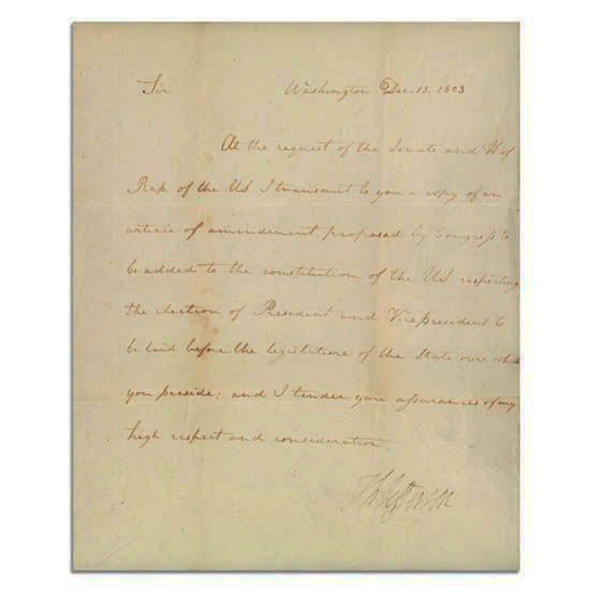 Important Thomas Jefferson letter signed ''Th Jefferson'' as President, dated 13 December 1803 from Washington. Letter, addressed to an unnamed Governor, sends a copy of proposed 12th amendment of the Constitution (not present) concerning the election of President and Vice-President. As described by the original provisions of the Constitution, each elector was to vote for two presidential candidates, and the candidate with the greater number of votes would then become president. In the election of 1800, the number of electoral votes for Jefferson and Burr were the same, leaving the responsibility of breaking the tie to the House of Representatives. The deadlock that ensued resulted in a crisis of uncertainty that was only resolved when Jefferson finally received a sufficient majority of state delegates on the 36th round of balloting. To prevent the possibility of the recurrence of such a crisis, several states proposed the amendment that accompanied the present letter. Reads in part: ''...At the request of the Senate and the H. of Rep. of the U.S. I transmit to you a copy of an article of amendment proposed by Congress to be added to the constitution of the U.S. respecting the election of President and Vice-President to be laid before the legislature of the State over which you preside...'' 7.5'' x 9.75'' document on one page is beautifully matted to 17.25'' x 14'' with a photo of Jefferson. Slight toning, dampstaining and expected folds else very good condition.