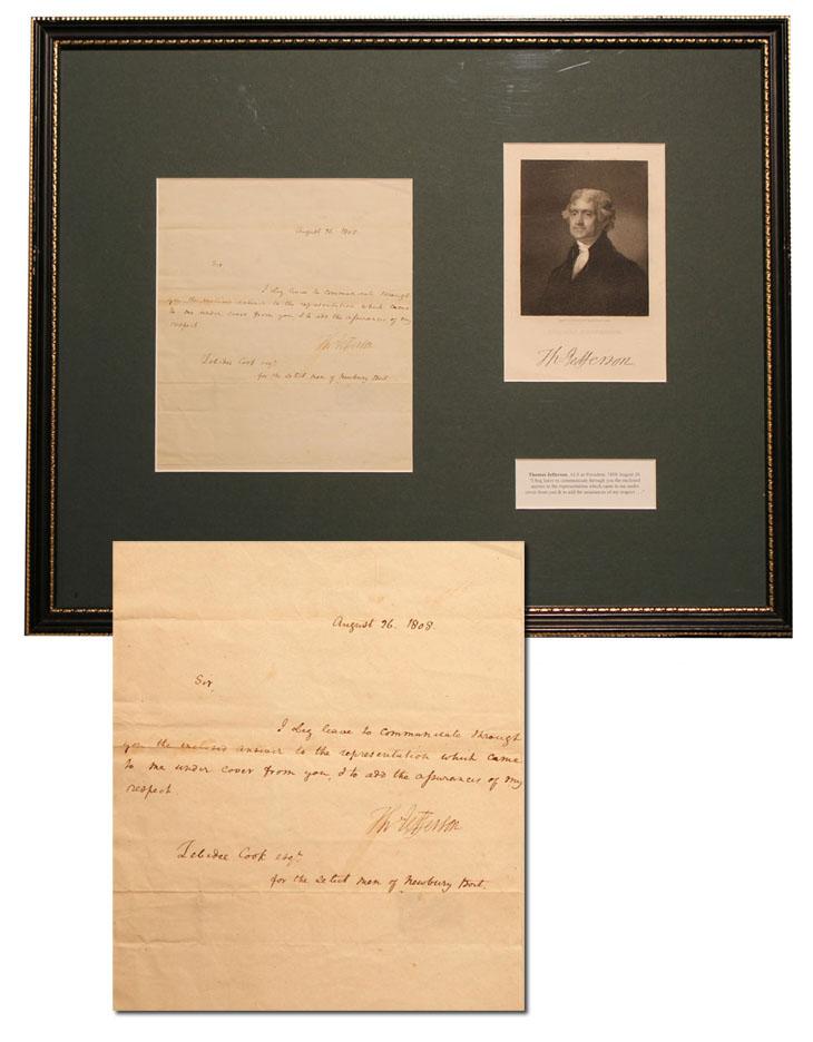 Thomas Jefferson letter signed as President, dated 26 August 1808. Letter is addressed to a Mr. Cook, Esq., and ''the select men of Newbury port'', which was a sea port in Massachusetts that began to decline after the Embargo Act of 1807. Letter reads, ''Sir, I beg leave to communicate through you the enclosed answer to the representation which came to me under cover from you, I do add the assurances of my respect. / Th. Jefferson''. Includes two notations on verso, one written at the time the letter was delivered and one by a previous owner in 1835. This letter is referenced in ''The Writings of Thomas Jefferson'' as a cover letter to a treatise by Jefferson defending the Embargo Act of 1807. In this longer letter, directed at residents of Newburyport, Boston and Providence, Jefferson writes, ''…to have submitted our rightful commerce to prohibitions and tributary exactions from others, would have been to surrender our independence. To resist them by arms was war, without consulting the state of things or the choice of the nation. The alternative preferred by the legislature of suspending a commerce…'' Jefferson wrote this letter in response to a coordinated orchestration of town meetings among the three port cities, and a subsequent flurry of petitions directed at Jefferson. Provenance from the Thomas Jefferson Library, consisting of a transcript of the ''Embargo letter'' and analysis of its significance, is included in the lot. Letter is housed in a black frame with grayish blue mat measuring 21'' x 17''. Letter, measuring 7'' x 8'', is in very good condition, with portion of paper missing on verso, though unnoticeable as the portion is located on a folded part of the letter which is not seen or written upon.