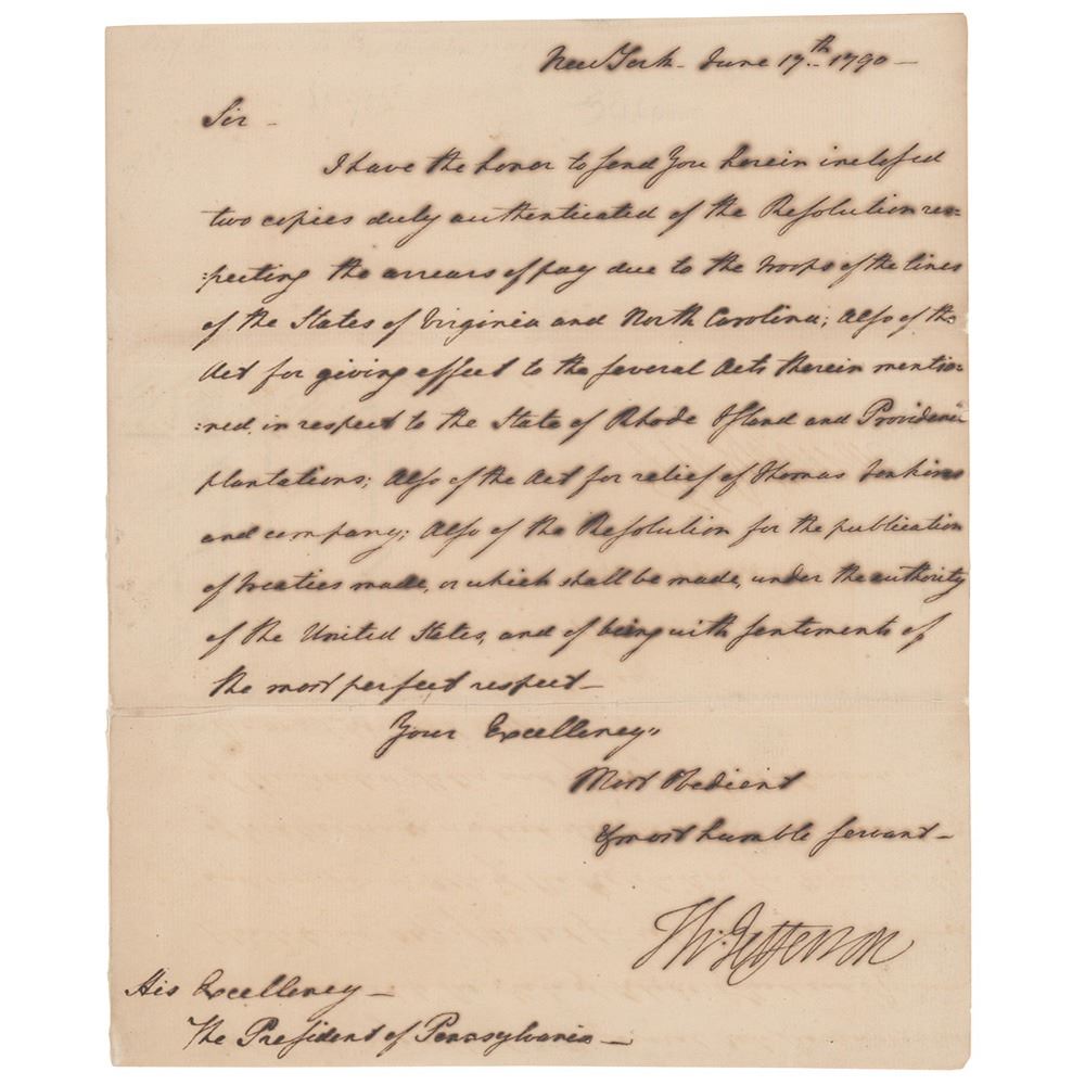LS as secretary of state, signed “Th: Jefferson,” one page, 8 x 9.75, June 17, 1790. Addressed from New York, a letter to Pennsylvania President and fellow Founding Father Thomas Mifflin, in full: "I have the honor to send you herein inclosed two copies duly authenticated of the Resolution respecting the arrears of pay due to the troops of the lines of the States of Virginia and North Carolina; also of the Act for giving effect to the several Acts therein mentioned in respect to the State of Rhode Island and Providence plantations; Also of the Act for relief of Thomas Jenkins and company; Also of the Resolution for the publication of treaties made, or which shall be made, under the authority of the United States, and of being with sentiments of the most perfect respect." The letter is affixed by its back left edge to an 11.25 x 14 sheet. In fine condition.