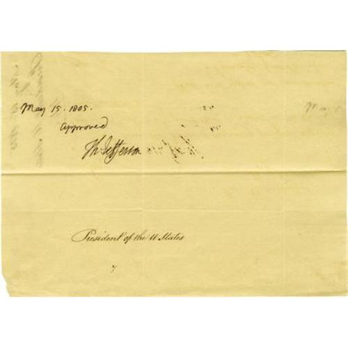 <B>Thomas Jefferson Presidential Approval Signed</B></I> “<I>May 15, 1805/Approved/Th: Jefferson,</B></I>” one page, 8” x 5.5”. The lower half of this sheet bears the words “<I>President of the U. States</B></I>” penned in an unknown hand. The page was folded in half vertically right after Jefferson signed it, so there is light offset to the right of Jefferson's signature. Fine presidential signature penned ten weeks after Jefferson was sworn in for his second term. Docketed in unknown hand on verso, “<I>May 15, 1805/President U. States/44</B></I>” with show-through behind Jefferson's “<I>May 15</B></I>.” Chipped at blank lower left corner. Fine condition.<BR><BR><b>Shipping:</b> Flat Material, Small (<a target="_blank" href="http://www.heritageauctions.com/common/shipping.php">view shipping information</a>)
