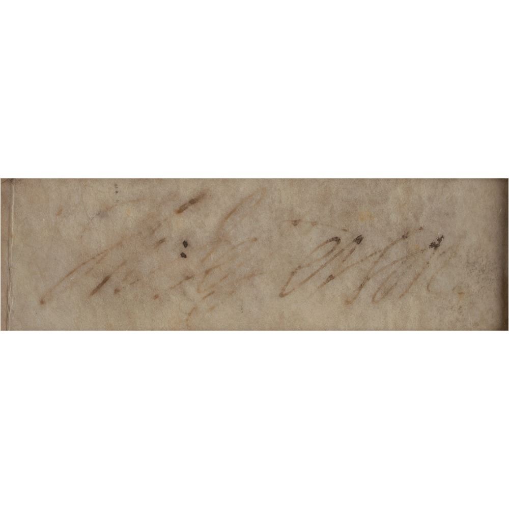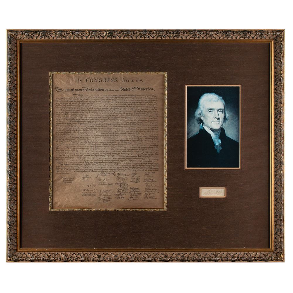 Ink signature, "Th; Jefferson," on an off-white clipped slip. Impressively double cloth matted and framed with a portrait of Jefferson and a printed copy of the Declaration of Independence, to an overall size of 31.5 x 26.5. In very good condition, with the signature light, but still legible.