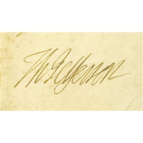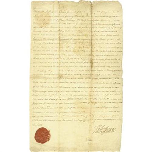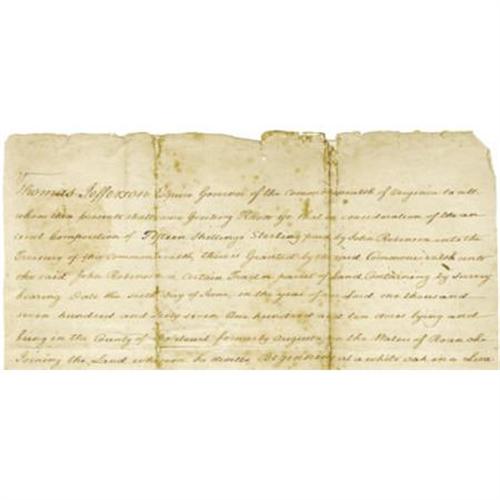 <B>Thomas Jefferson Signed Land Grant</B></I>. One page, 9.25” x 15”, Richmond, Virginia, July 20, 1780. This document granting a parcel of land to John Robinson was written in another hand but signed <I>“Th: Jefferson”</B></I> by the future President during his term as Governor of Virginia (1779-1781). The official seal of the Commonwealth of Virginia is also included at bottom left. The verso includes the address of the recipient. Also included in this lot is a 5” x 7” etching of the Third President. The letter is in fair-good condition with some folds (some reinforced on verso with archival tape), soiling, staining, and foxing.<BR><BR><b>Shipping:</b> Flat Material, Small (<a target="_blank" href="http://www.heritageauctions.com/common/shipping.php">view shipping information</a>)