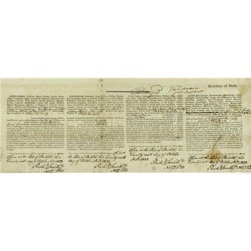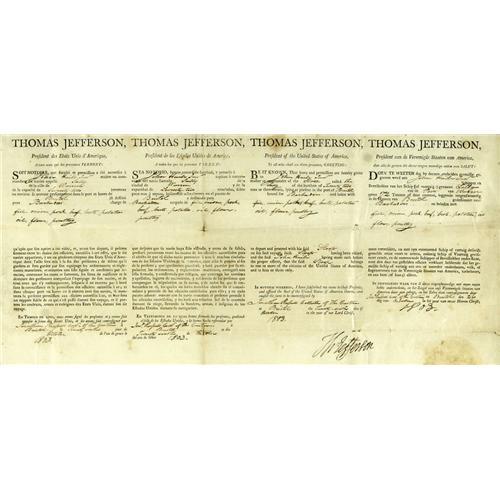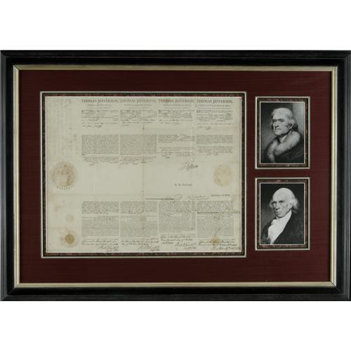 <B>Thomas Jefferson and James Madison Four Language Ship's Sea Letter Signed</B></I> "<I>Th: Jefferson</B></I>" as President and "<I>James Madison</B></I>" as Secretary of State. One page, 20.5" x 16"; partly printed in four languages: French, Spanish, English, and Dutch; Bristol, Connecticut; October 26, 1803. It reads in part, "<I>BE IT KNOWN, That leave and permission are hereby given to John Haile Junr. master or commander of the sloop called The Sally of the burthen of twenty two tons or thereabouts, lying at present in the port of Bristol bound for Bourbon, and laden with fish, onions, pork, beef, beets, potatoes, oil, flour, poultry to depart and proceed with his said sloop on his said voyage, such sloop having been visited and the said John Haile having made oath before the proper officer, that the said sloop belongs to one or more of the citizens of the United States of America, and to him or only them…</B></I>" There is a 3" paper seal of the United States affixed on the left, and a smaller 2" seal affixed below it. The document is elaborately matted and framed along side two handsome engravings of Jefferson and Madison. The entire piece measures 36" x 26".<BR><BR>The document is in fine condition; usual folds are present; several areas of foxing; transference visible from the seals, which are still intact; docketing information on verso.