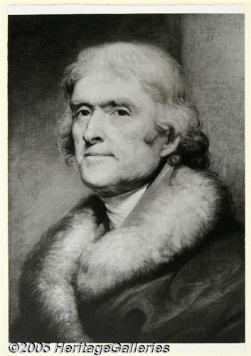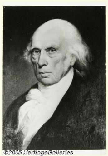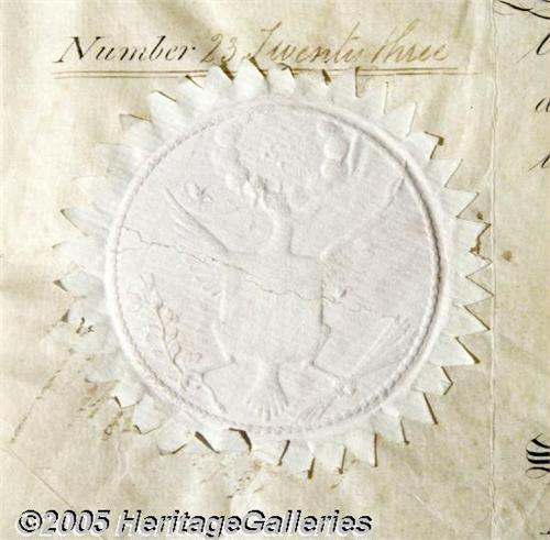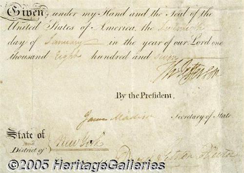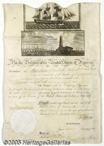 <B>Thomas Jefferson and James Madison Signed Ship's Passport, 1807</B></I> Partly-printed document signed, "Th:Jefferson" as President and "James Madison" as Secretary of State, 15.25" x 10.25" on vellum, Washington, January 20, 1807. A scallop top, Mediterranean Ship's Passport, issued to Nathaniel Howard, master of the Ship <I>Susan</B></I> "...the burthen of Two hundred twenty 9/95 tons or thereabouts, mounted with no guns navigated with Ten men..." With two beautiful vignettes of a sailing ship and a lighthouse, the top edge is scalloped as required for a Mediterranean ship's passport. The Mediterranean Passport, commonly called a ship's passport, was created after the United States concluded a treaty with Algiers in 1795. During the early years of independence, America was one of several nations paying tribute to the Barbary states in exchange for the ability to sail and conduct business in the Mediterranean area without interference. This treaty provided American-owned vessels with a "Passport" that would be recognized by Algeria and later by other Barbary states, small Muslim strongholds on the coast of Africa including Tunis and Tripoli, through similar treaties. These passports were intended to serve as additional evidence of official nationality. After they were printed and signed by the President and Secretary of State, they were cut along the waved line and the top portion and sent to the U.S. Consuls along the Barbary Coast where they were used to authenticate the passports. Light soiling and the expected folds, but otherwise boldly signed by Jefferson and Madison and very attractive with an intact paper seal. Matted with bust portraits of both Jefferson and Madison. <I>From the collection of Bradley O'Leary.</B></I> <I>Accompanied by COA from PSA/DNA.</B></I>