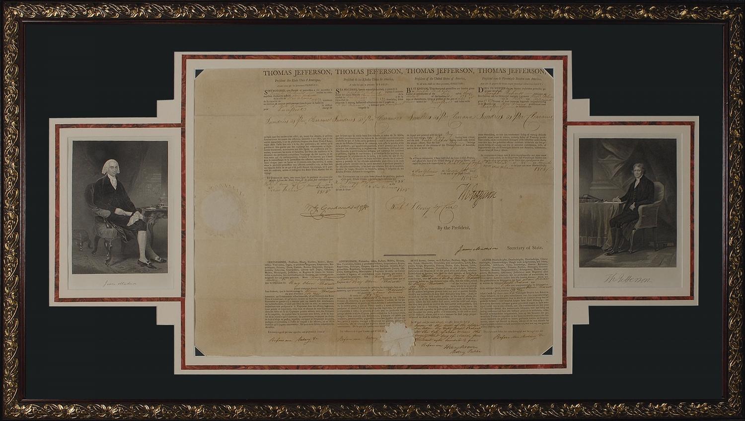 DS signed by Jefferson as president and Madison as secretary of state, one page, 20 x 16, March 25, 1805. Four language ship’s paper issued to “Joseph Richards master or commander of the brig called Oliver Wolcott of the burden of 178 29/95 tons or thereabouts, lying at present in the port of New Orleans bound for Liverpool and laden with Sundries as per Clearance.” Signed in the middle, “Th: Jefferson,” and further below “James Madison.” Impressively double matted and framed, with sitting portraits of Jefferson and Madison, to an overall size of 42 x 23.5. In very good condition, with several intersecting folds, some scattered light toning and spotting, and two worn but intact seals. Both signatures are bold, and Jefferson’s is unusually distinctive.