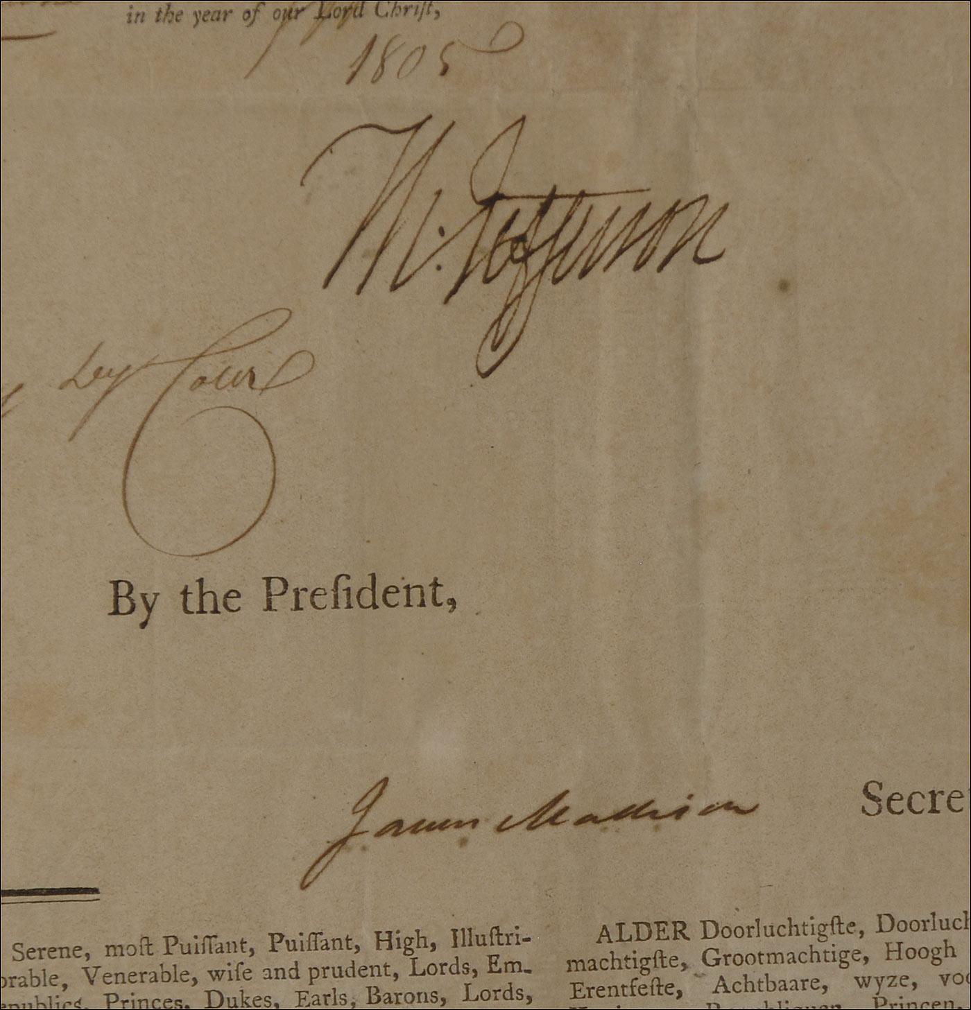 The Port of New Orleans came under America’s authority a little over a year earlier as part of the Louisiana Purchase. In fact, it was the 1802 French closure of that port to US commercial trade that prompted Jefferson to negotiate the acquisition of the port—essential for the protection of the economy profitability of the western states and territories. The brig Oliver Wolcott was one of the many that would use the port to carry out trade. The largest Jefferson signature we have seen! Oversized.