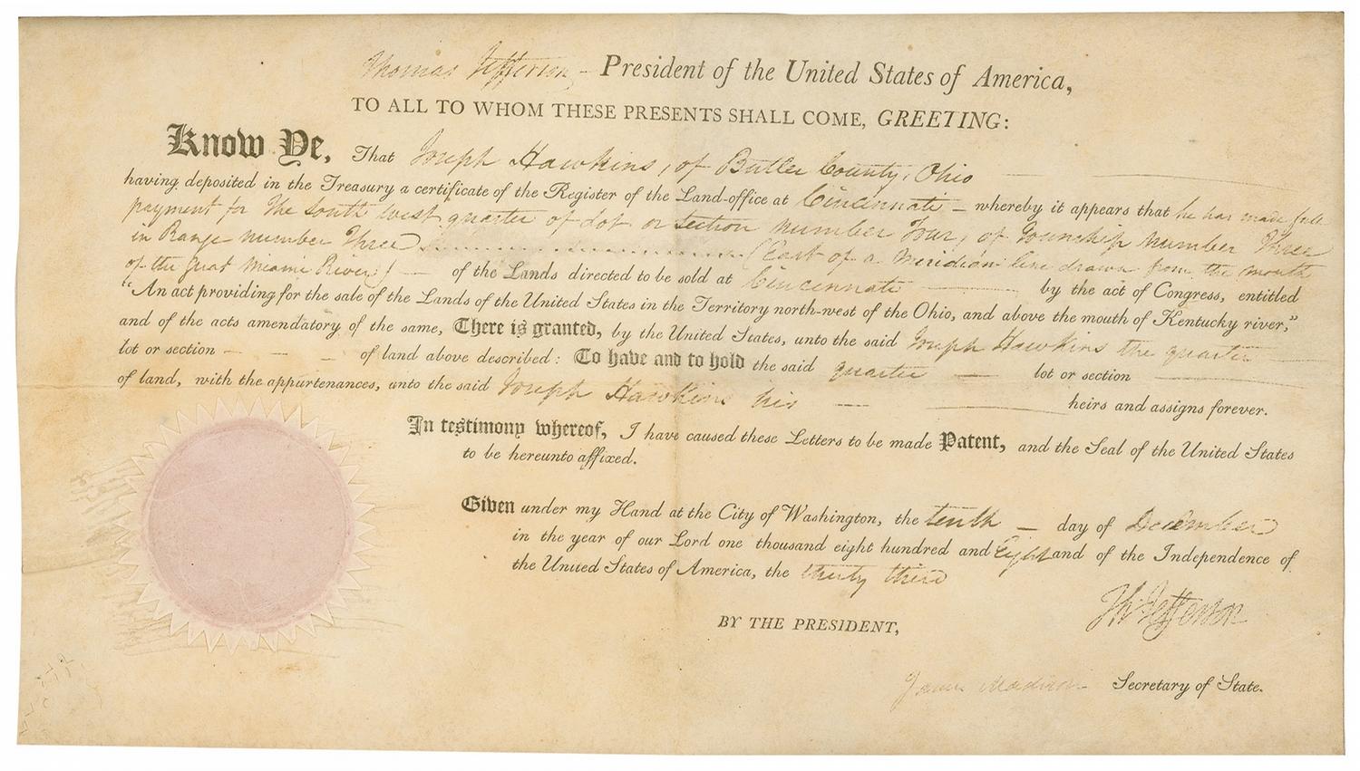 Partly-printed vellum DS, signed “Th: Jefferson” as President and “James Madison” as Secretary of State, one page, 15 x 8.5, December 10, 1808. Land grant issued to Joseph Hawkins. In part: “That Joseph Hawkins of Butler Country Ohio…has made full payment for the South West quarter of lot or section number Four…from the mouth of the great Miami River…directed by the act of Congress, entitled 'An act providing for the sale of the Lands of the United States in the Territory north-west of the Ohio, and above the mouth of the Kentucky River'….” In very good condition, with light overall skipping to Jefferson’s signature, Madison’s signature fairly light, but still completely legible, central horizontal and vertical fold, mild toning and creasing, and intentional scoring around seal. The white seal is slightly worn, but intact.