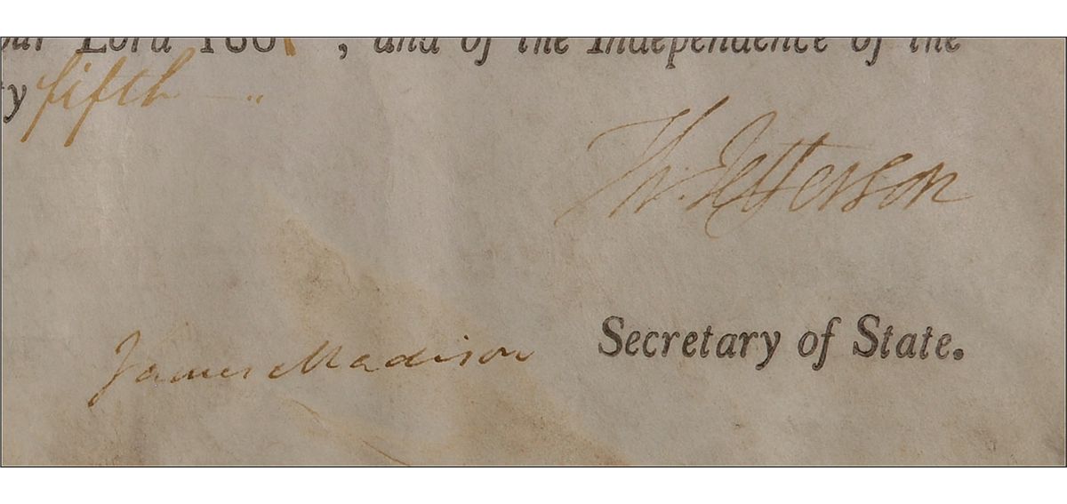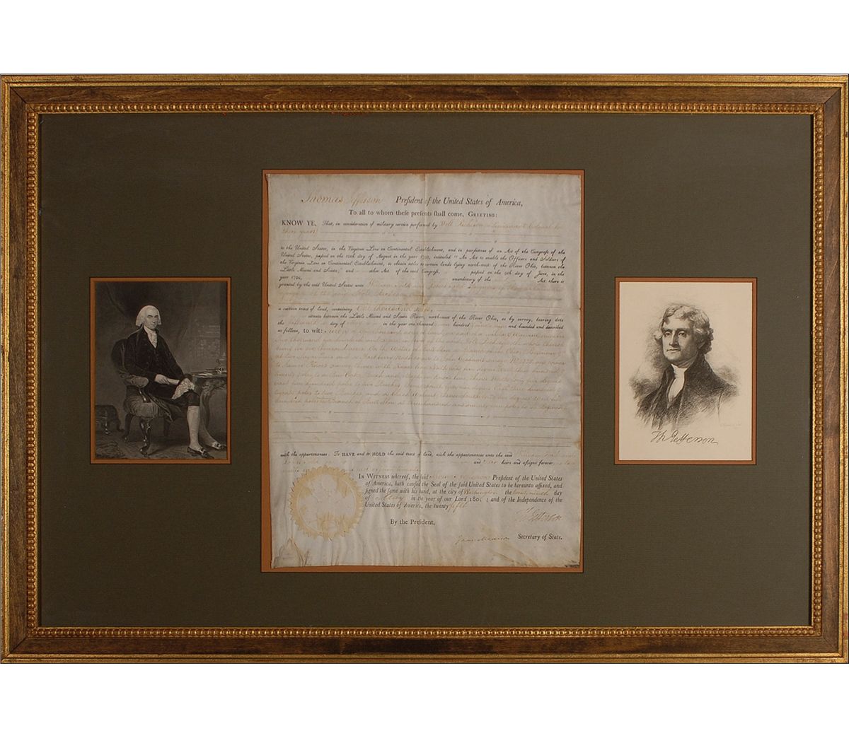 Partly printed DS, signed “Th: Jefferson” as president and “James Madison” as secretary of state, one page on vellum, 12 x 15.5, May 29, 1801. A grant for a 1000-acre parcel of land, issued to Holt Richeson, “a Lieutenant Colonel for three years,” under the provisions of “An Act to enable the Officers and Soldiers of the Virginia Line on Continental Establishment.” Signed at the conclusion by Jefferson and countersigned by James Madison. Matted and framed with portraits of Jefferson and Madison to an overall size of 33.5 x 23.5. Previous storage folds, scattered wrinkling and soiling, light mirroring of text, and a worn but intact seal, otherwise very good condition. Colonel W. Holt Richeson served in the Revolutionary War, and was given grants of land in Ohio and Kentucky. A very desirable presidential combination. Oversized.