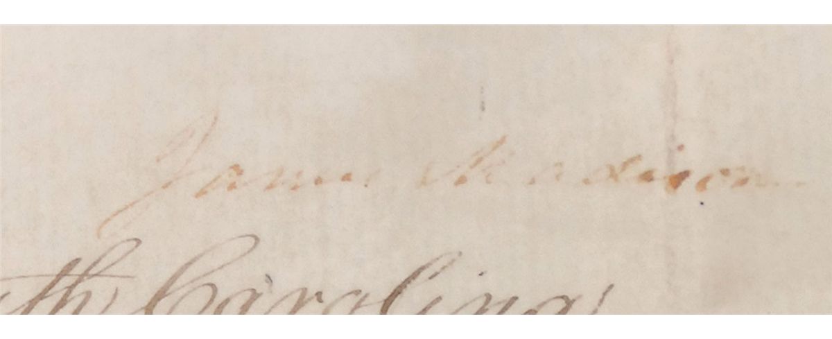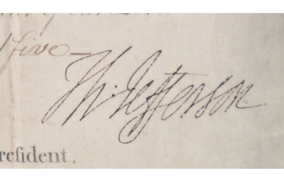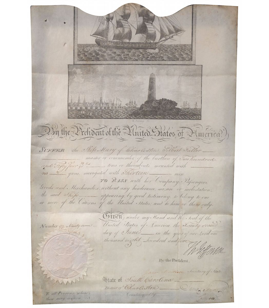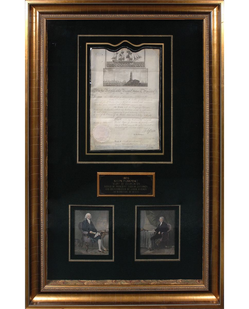 Partly-printed vellum DS, signed “Th: Jefferson” as president and “James Madison” as secretary of state, one page, 10 x 15.5, June 22, 1805. Scalloped-top ship’s papers issued to the “Ship Mary of Charleston, Gilbert Fuller, master and commander…mounted with no guns navigated by thirteen men to pass with her Company Passengers, Goods and Merchandise without any hindrance, seizure or molestation.” Signed at the conclusion by Jefferson and Madison. Grandly double-cloth-matted and framed by the Kenneth Laurence Gallery, with color portraits of Jefferson and Madison and an informational plaque, to an overall size of 29 x 45 x 3.75. Intersecting folds, one through a single letter of Madison’s signature, Madison’s signature a shade or two light but still legible, two small holes to upper left, and some scattered light soiling, otherwise fine condition. The white wafer seal is crisp and intact. A very presentable example of a most desirable combination of presidents boasting a particularly bold Jefferson signature. Oversized.