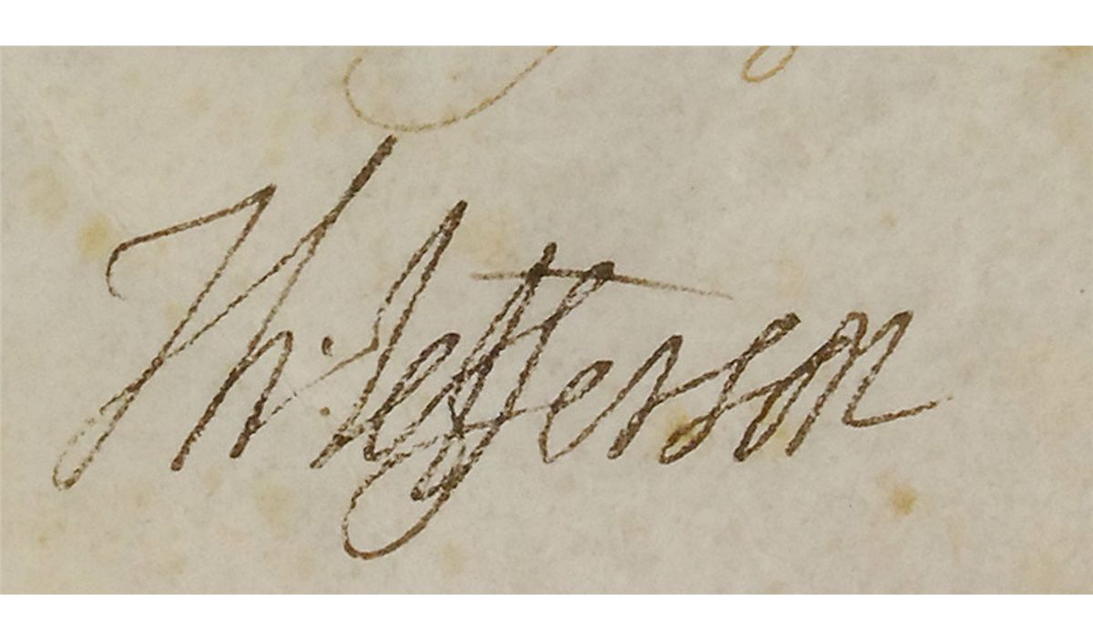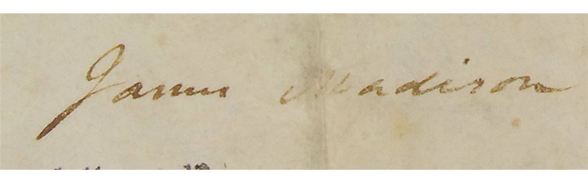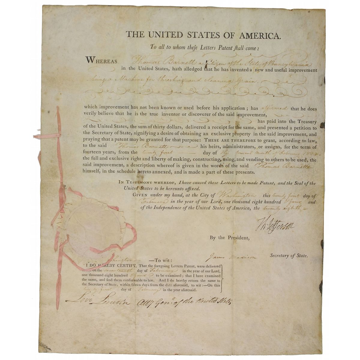 Partly-printed vellum DS, signed “Th: Jefferson” as President and “James Madison” as Secretary of State, two pages, 11.75 x 14.5, February 21, 1804. A patent issued to “Thomas Barnett, a citizen of the State of Pennsylvania in the United States, hath alleged that he has invented a new and useful improvement being a machine for threshing and cleaning grain.” Boldly signed at the conclusion by Jefferson, as well as by Madison, and countersigned by Attorney General Levi Lincoln. The second page, still attached with its original pink ribbon contains a detailed description of the patent signed by Barnett. In very good condition, with intersecting folds, one through a single letter of Madison’s signature, scattered toning and foxing, with some heavier toning and staining to Barnett’s page, as well as some scattered small holes to second page. The white wafer seal is toned, but still intact, complete with its ribbon, and Jefferson’s signature is particularly nice.