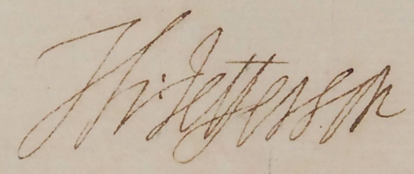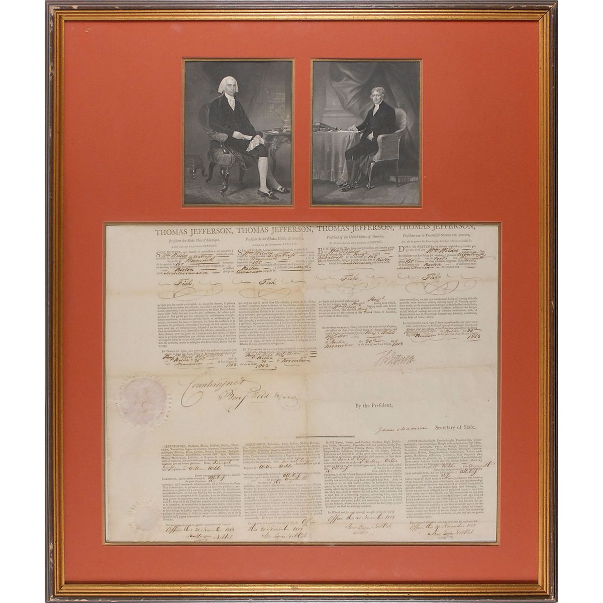 Partly-printed DS, signed “Th: Jefferson” as president and “James Madison” as secretary of state, one page, 19 x 15.5, November 30, 1803. Four-language ship’s papers issued to “Wm. Wildes master or commander of the Brig called Albatross…lying at present in the port of Boston bound for Mediterranean and laden with Fish.” Double-matted and framed with portraits of Jefferson and Madison to an overall size of 25.5 x 30. In very good condition, with intersecting folds, several apparent repairs to reverse of some folds and separations, not affecting either signature, and scattered toning. Jefferson’s signature is particularly crisp and bold, and the white seal is worn, but intact. A desirable combination of presidents sending a ship to the dangerous region just a month after the capture of the USS Philadelphia. Oversized.