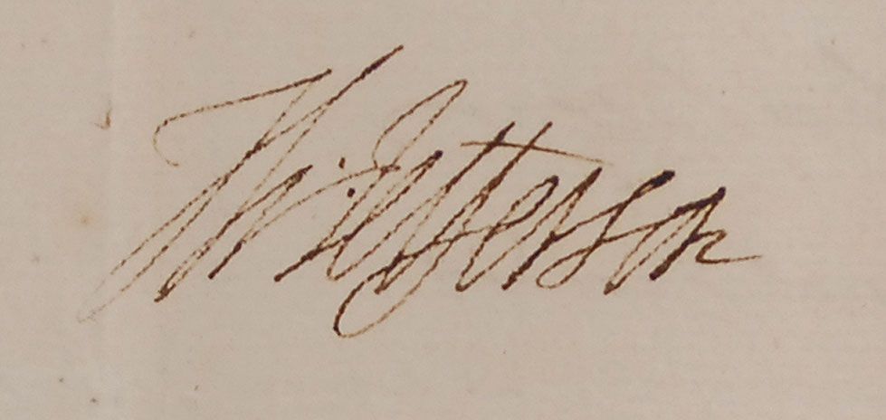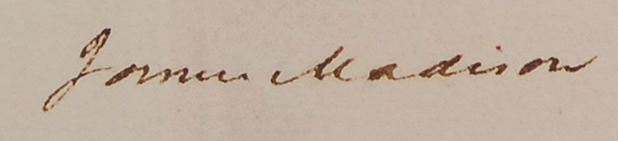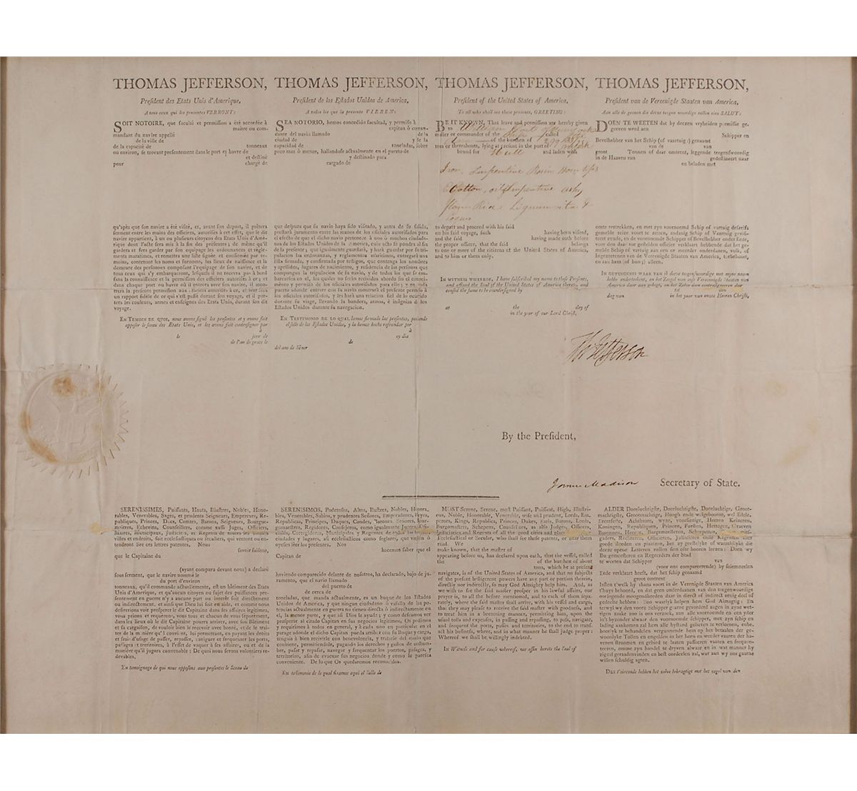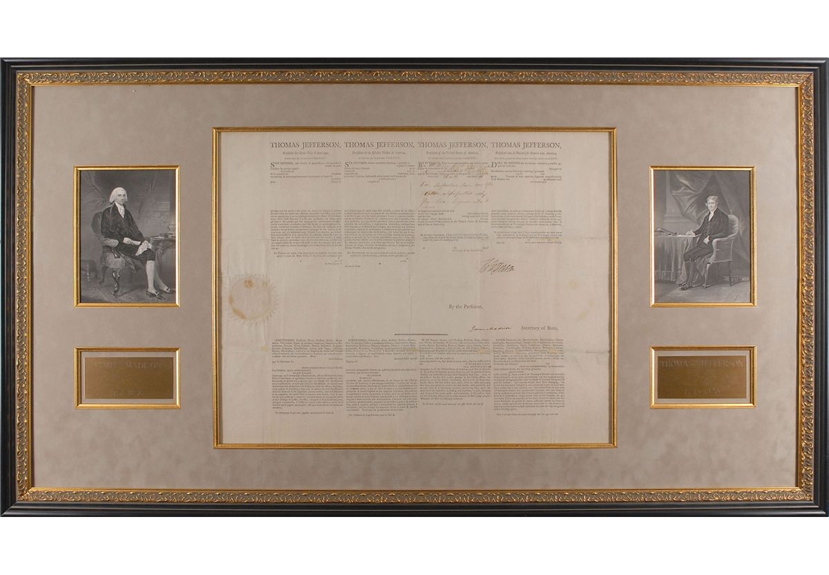 Partly-printed DS as president, one page, 21 x 16.75, no date. Four-language ship’s papers filled out in the English section only, issued to “William Coit, master and commander of the ship called the Ann…lying at present in the port of New York bound fir Hull and laden with Iron, Turpentine, Rosin…Cotton, oil of Turpentine, Ash, Flour, Rice, Lignum vitae.” Boldly signed under the panel, “Th: Jefferson,” and countersigned by Secretary of State James Madison. Impressively suede-matted and framed with engraved portraits of Jefferson and Madison and two small name plaques to an overall size of 45 x 25.5. In fine condition, with expected folds, one through a single letter of each signature, some small repairs along a couple of folds affecting a few lines of text, some mild toning from mirroring of seal, with the seal itself lightly toned and having a small vertical crease. A very presentable example of this most desirable combination of presidents. Oversized.