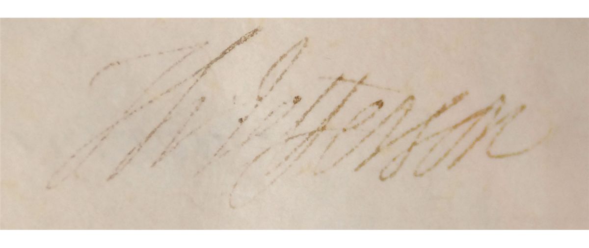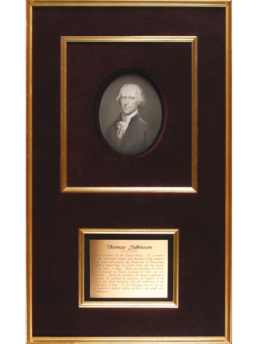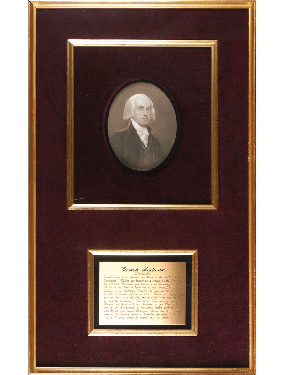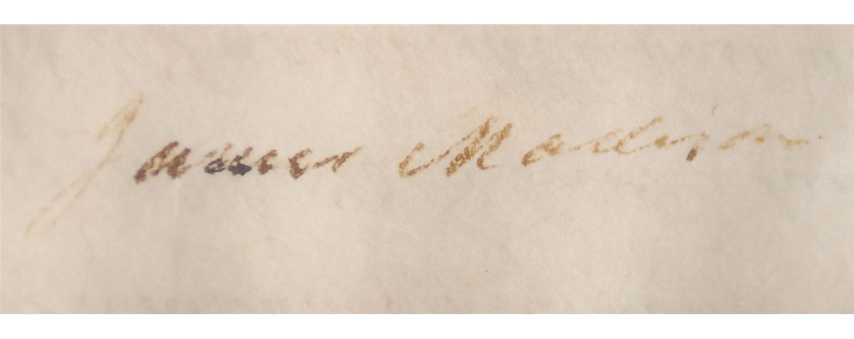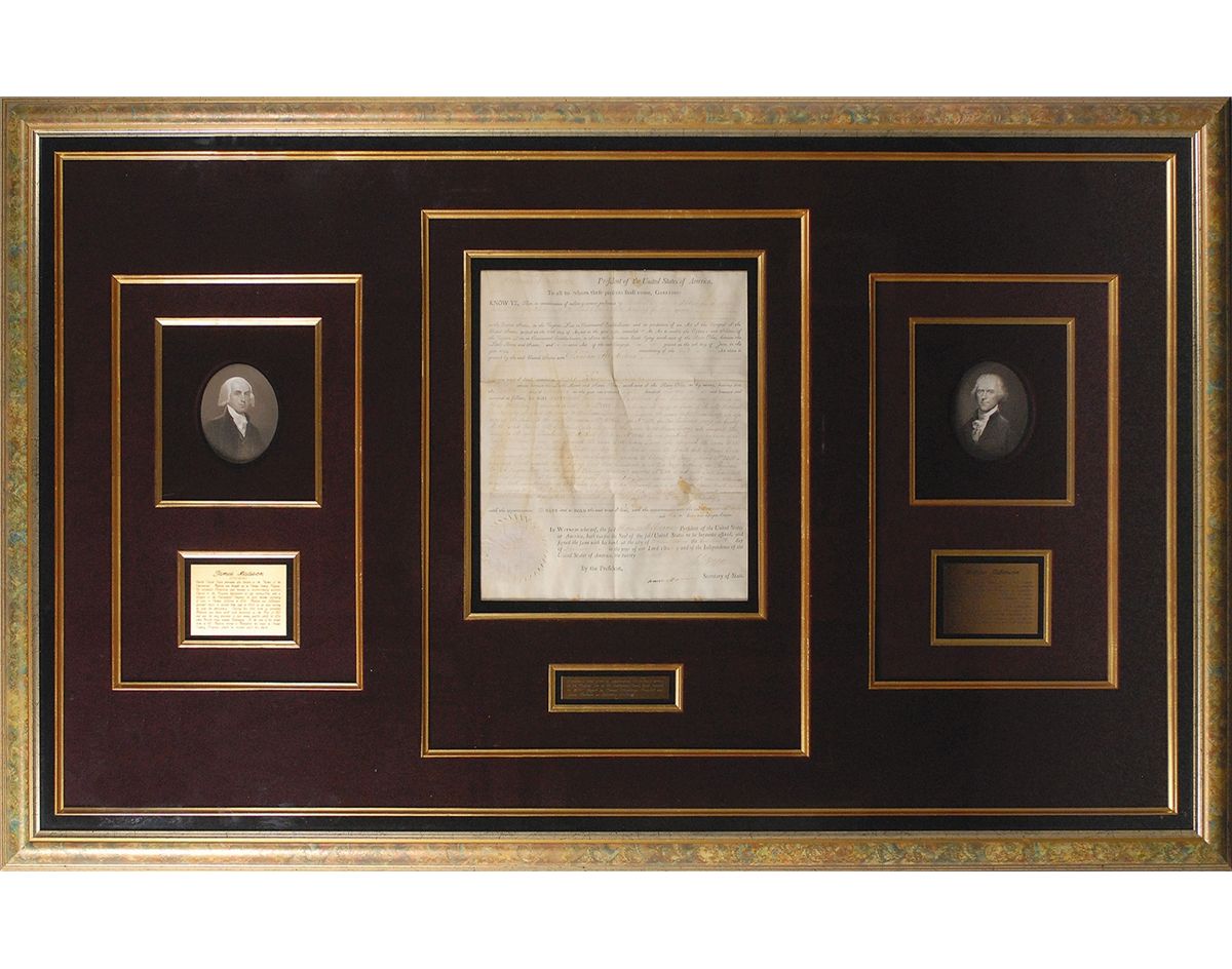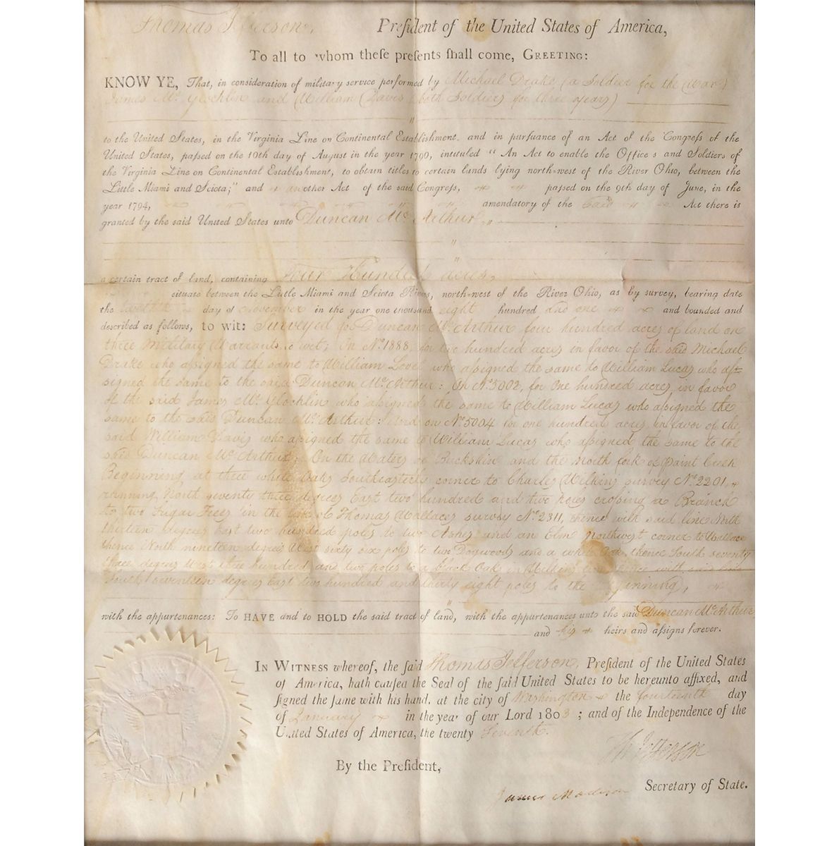 Partly-printed vellum DS, signed “Th: Jefferson” as president and “James Madison” as secretary of state, one page, 11.5 x 14, January 14, 1803. President Jefferson issues a land grant for military service. In part: “In consideration of military service performed by Michael Drake (a Soldier for the war) James McGlochlin and William Davis (both Soldiers for three years) to the United States, in the Virginia Line on Continental Establishment…there is granted…a certain tract of land, containing Four Hundred acres situate between the Little Miami and Sciota Rivers.” Signed at the conclusion by President Jefferson and countersigned by Secretary of State Madison. The crisply embossed white paper seal affixed to the lower left remains fully intact. Massively double-suede-matted and framed with portraits of both statesmen and three engraved plaques to an overall size of 34.5 x 55. In very good condition, with intersecting folds, a few noticeable stains and wrinkles, and fading to a few letters in the signatures. A beautifully displayed and immensely desirable combination of presidents on a document concerning service during the Revolutionary War. Oversized.