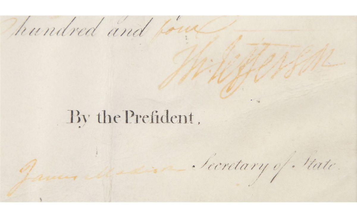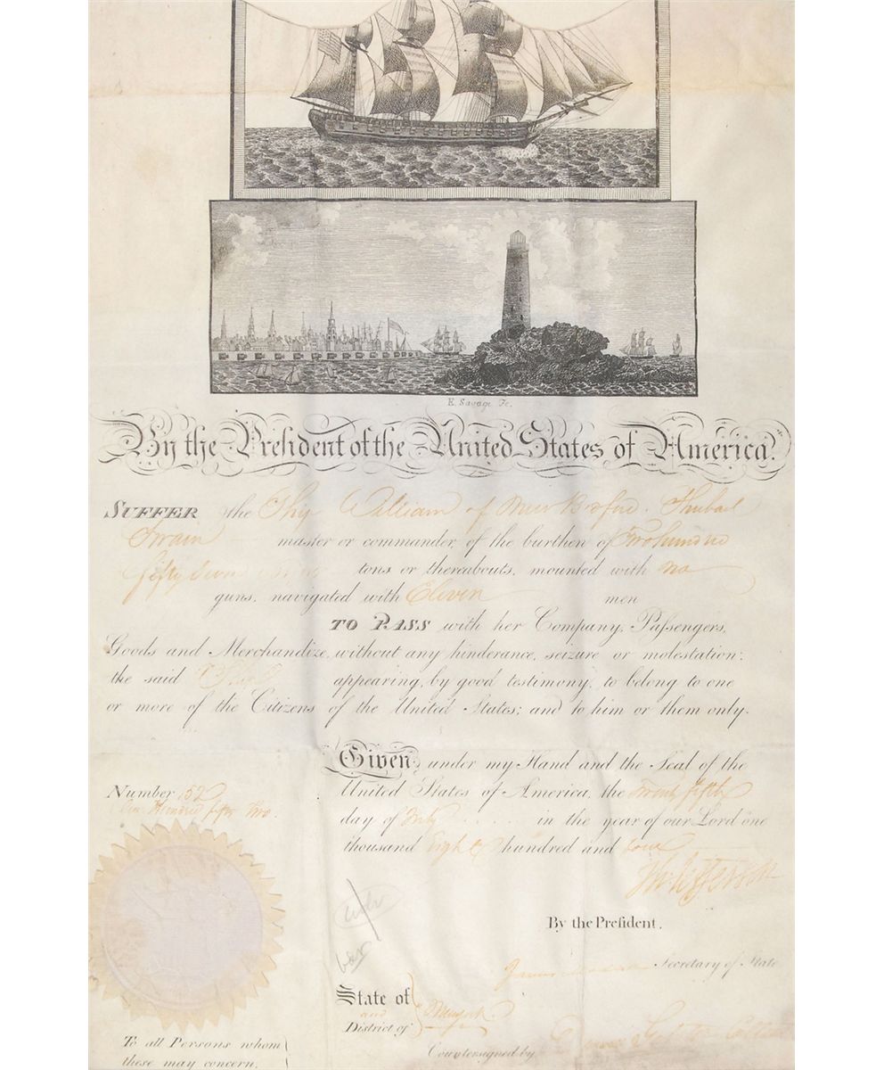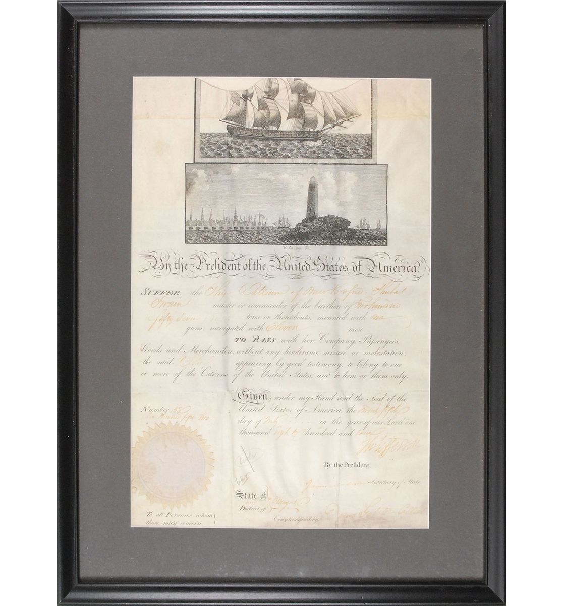 Scarce partly-printed vellum DS, signed “Th: Jefferson” as president and “James Madison” as secretary of state, one page, 10 x 15, July 25, 1804. Scalloped-top ship’s pass issued for “the Ship William of New Bedford, Shubael Swain master or commander…mounted with no guns, navigated with Eleven men to pass with her Company, Passengers, Goods and Merchandize without any hindrance, seizure or molestation.” Signed at the conclusion by President Jefferson and Secretary of State Madison. Matted and framed to an overall size of 15 x 20. The white paper seal affixed to the lower left remains crisply embossed and intact. In very good to fine condition, with intersecting folds (one vertical fold passing through a single letter of Madison’s signature), writing and signatures generally light but legible, and light soiling to the bottom. A highly desirable ship’s paper with an attractive engraved vignette, signed by a most desirable presidential combination.