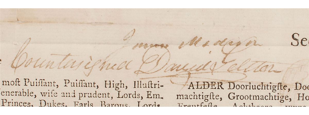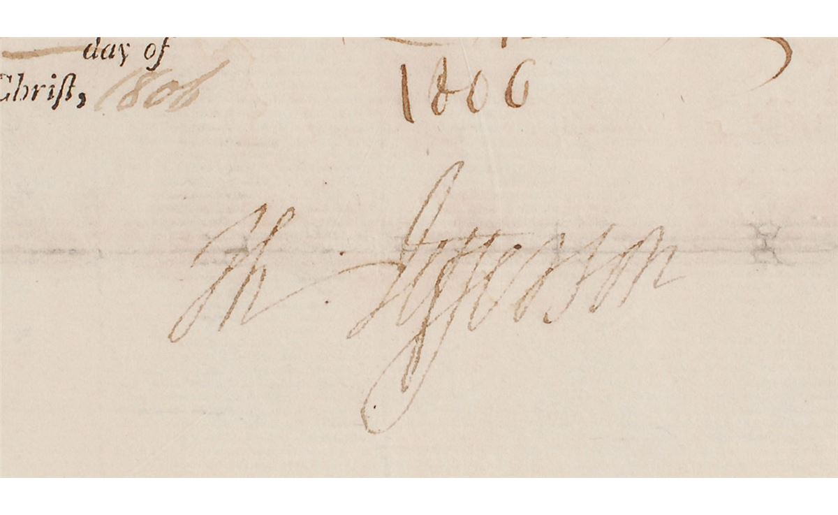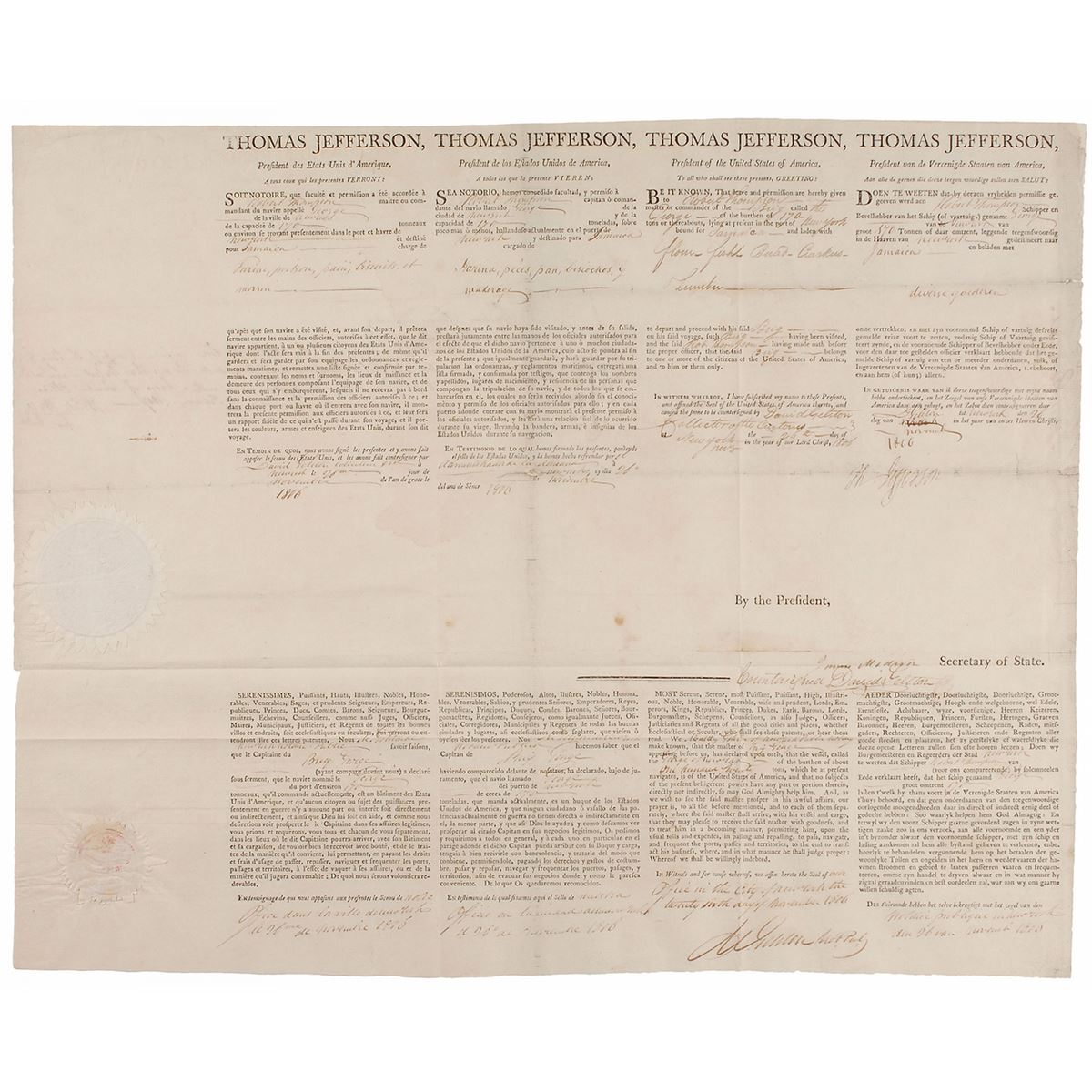 Partly-printed DS, signed “Th: Jefferson” as president and “James Madison” as secretary of state, one page, 20.5 x 16.25, November 26, 1806. Four-language ship’s papers issued to “Robert Thompson master or commander of the Brig called the George…lying at present in the port of New York bound for Jamaica and laden with flour, fish, bread, crackers, and lumber.” Signed in the center by President Jefferson and countersigned below by Secretary of State Madison. Retains the two white seals affixed to the left side. Repaired partial separations to intersecting folds (horizontal holds passing through both signatures), some repaired chipping to the right edge, and expected document wear, otherwise fine condition. Overall, this is an exceptionally well-preserved, bright, clean example.