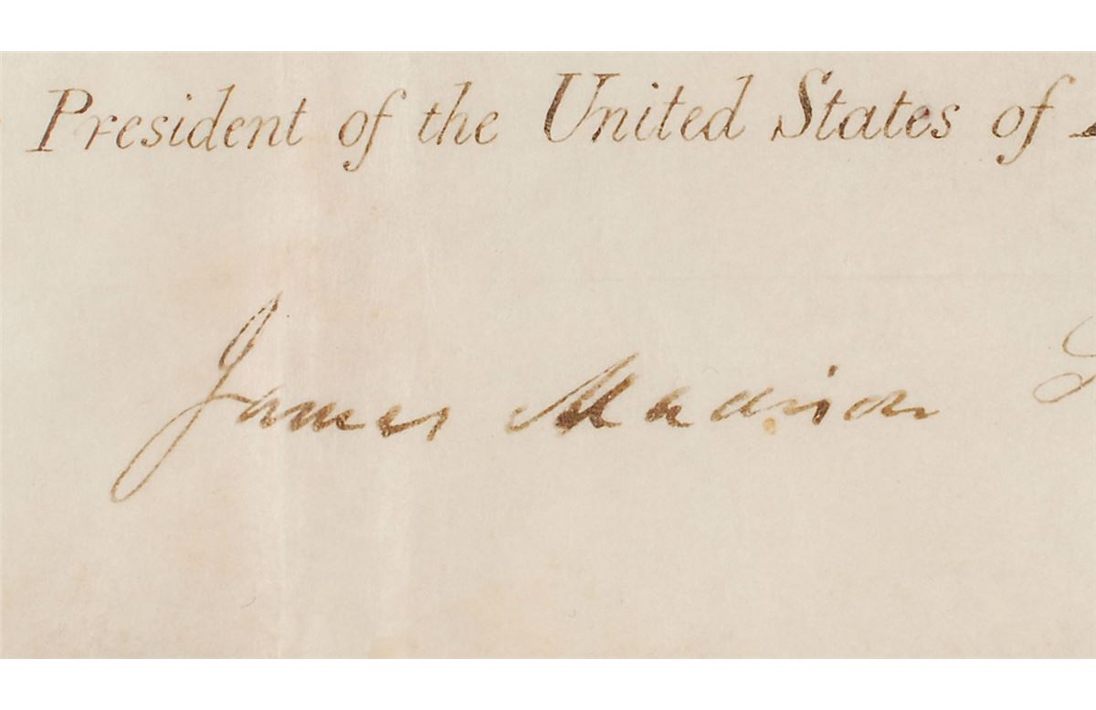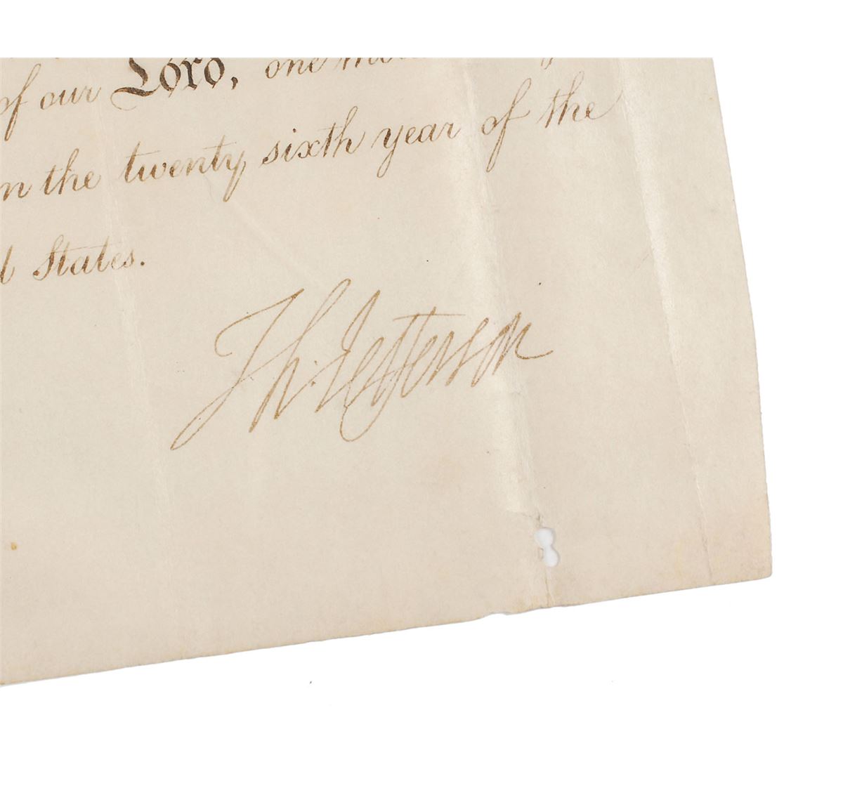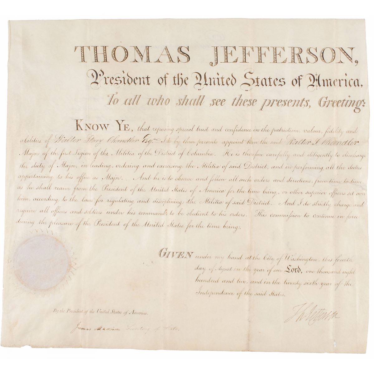 Magnificent vellum manuscript DS, signed “Th: Jefferson” as president and “James Madison” as secretary of state, one page, 15.5 x 14.25, August 4, 1802. President Jefferson appoints Walter Story Chandler as “Major of the first Legion of the Militia of the District of Columbia.” Beautifully signed at the conclusion by President Jefferson and countersigned by Secretary of State Madison. The crisply embossed white paper seal affixed to the lower left remains fully intact. In fine condition, with intersecting folds (vertical folds passing through single letters of each signature), scattered creases and wrinkles, and a trivial hole to lower right; overall an impeccable, remarkably clean and bright early American presidential appointment. Despite being similar in appearance to a typical partly-printed document, this example was accomplished entirely by hand; even the minutely detailed lettering at the top was done by a skilled calligrapher.