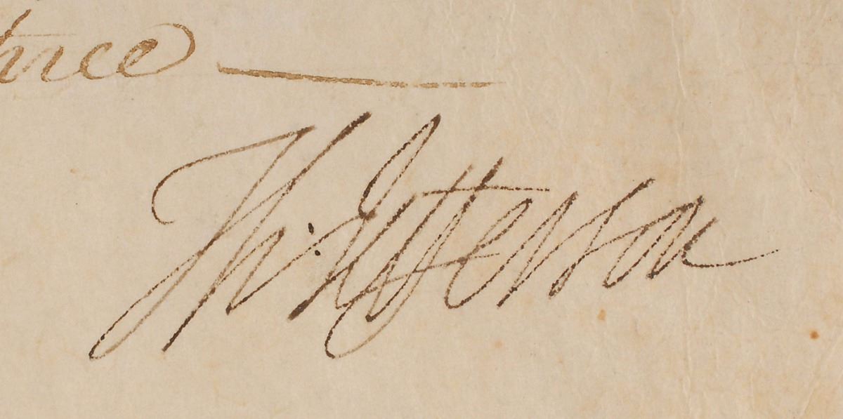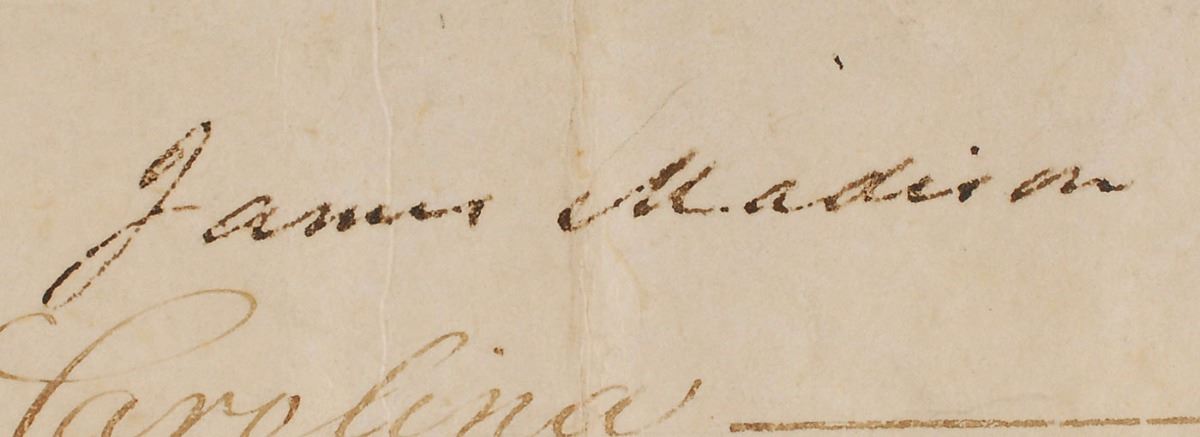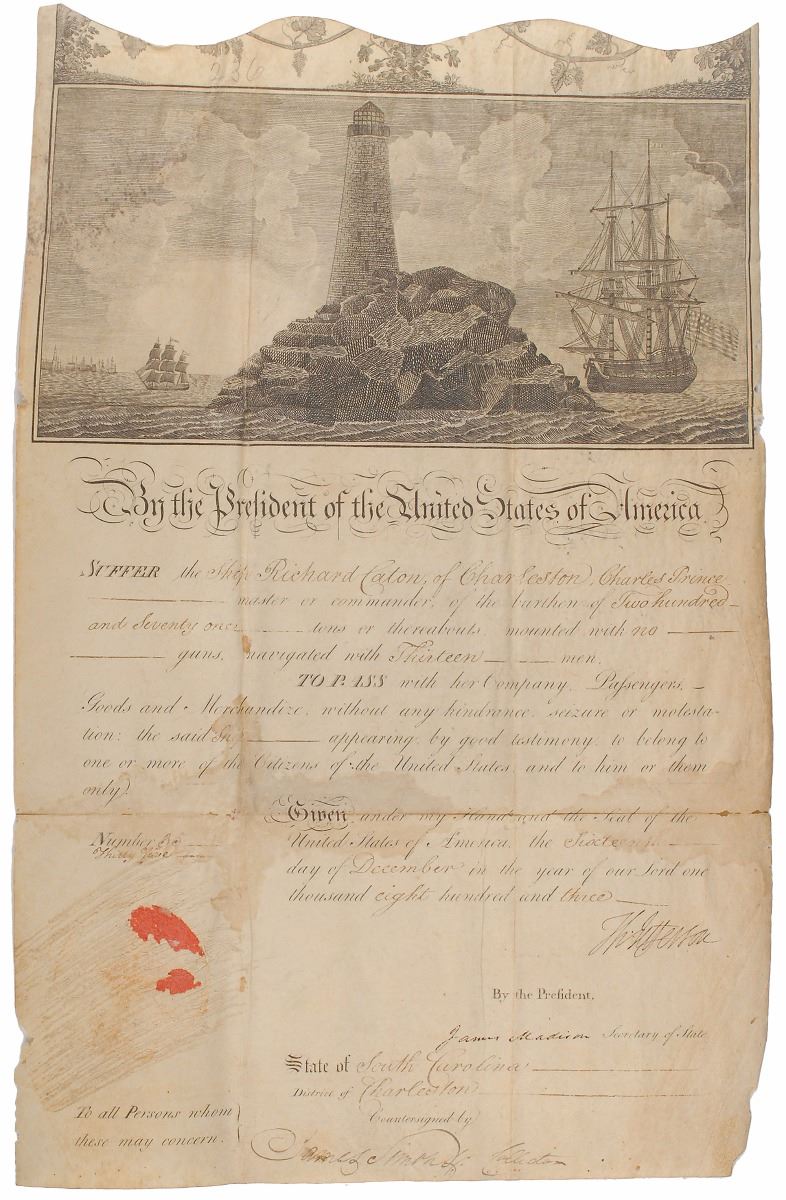 Partly-printed vellum DS, signed “Th: Jefferson” as president and “James Madison” as secretary of state, one page, 12 x 18, December 16, 1803. Scallop-topped ship’s pass issued for “the Ship Richard Caton of Charleston, Charles Prince master or commander…navigated with Thirteen men, to pass with her Company, Passengers, Goods and Merchandize without any hindrance, seizure or molestation.” Signed at the conclusion by President Jefferson and Secretary of State Madison. Only remnants of the seal remain affixed to lower left. In very good condition, with intersecting folds (one vertical fold passing through the first letter of Madison’s surname), dampstaining to lower folds, scrapes and scuffs to seal area, and some small chips and paper loss to folds and edges; both signatures are extremely bold, crisp examples superior to those typically seen.