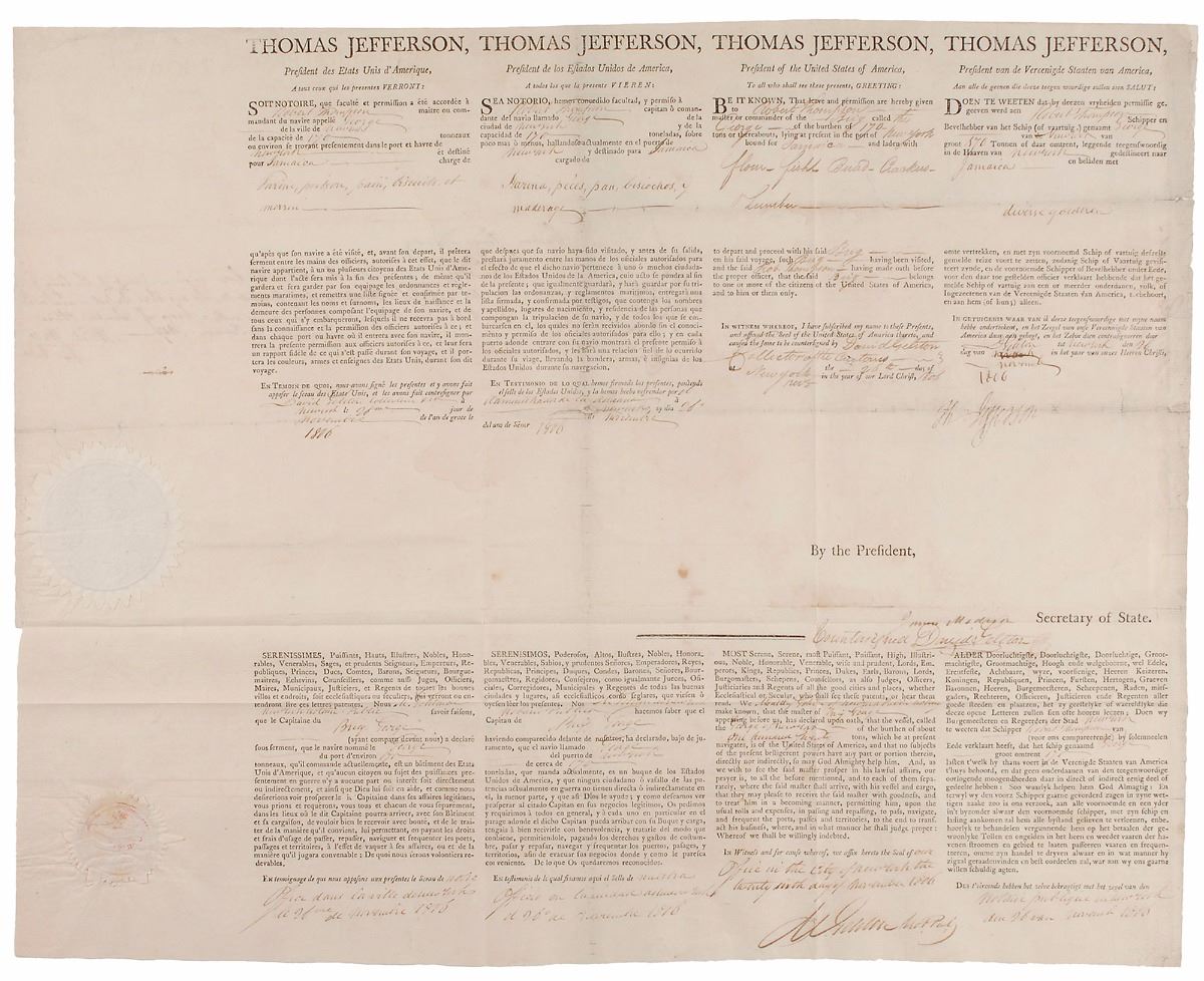 Partly-printed DS, signed “Th: Jefferson” as president and “James Madison” as secretary of state, one page, 20.5 x 16.25, November 26, 1806. Four-language ship’s papers issued to “Robert Thompson master or commander of the Brig called the George…lying at present in the port of New York bound for Jamaica and laden with flour, fish, bread, crackers, and lumber.” Signed in the center by President Jefferson and countersigned below by Secretary of State Madison. Retains the two white seals affixed to the left side. Repaired partial separations to intersecting folds (horizontal holds passing through both signatures), some repaired chipping to the right edge, and expected document wear, otherwise fine condition. Overall, this is an exceptionally well-preserved, bright, clean example.