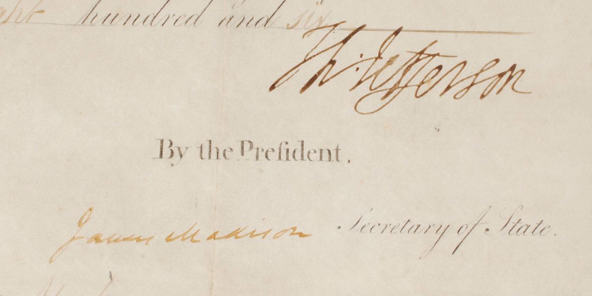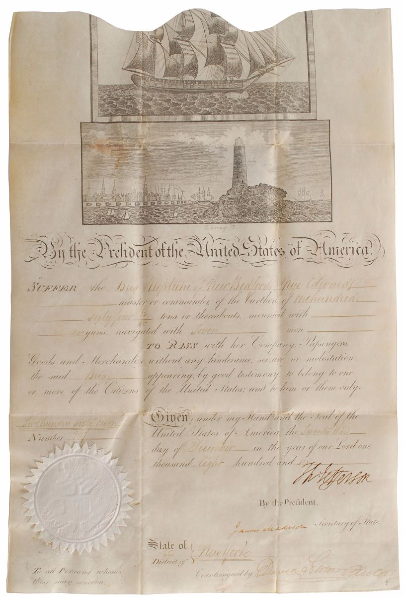 Choice partly-printed vellum DS, signed “Th: Jefferson” as president and “James Madison” as secretary of state, one page, 10.25 x 15.5, December 23, 1806. Scallop-topped ship’s pass issued for “the Brig Neptune of New Bedford, Nye Edwards master or commander…To Pass with her Company, Passengers, Goods and Merchandize, without any hinderance, seizure or molestation.” Boldly signed at the conclusion by President Jefferson and countersigned by Secretary of State Madison. The white paper seal affixed to the lower left remains fully intact and especially crisp. In fine condition. A highly desirable format featuring an especially bold and prominent Jefferson signature.