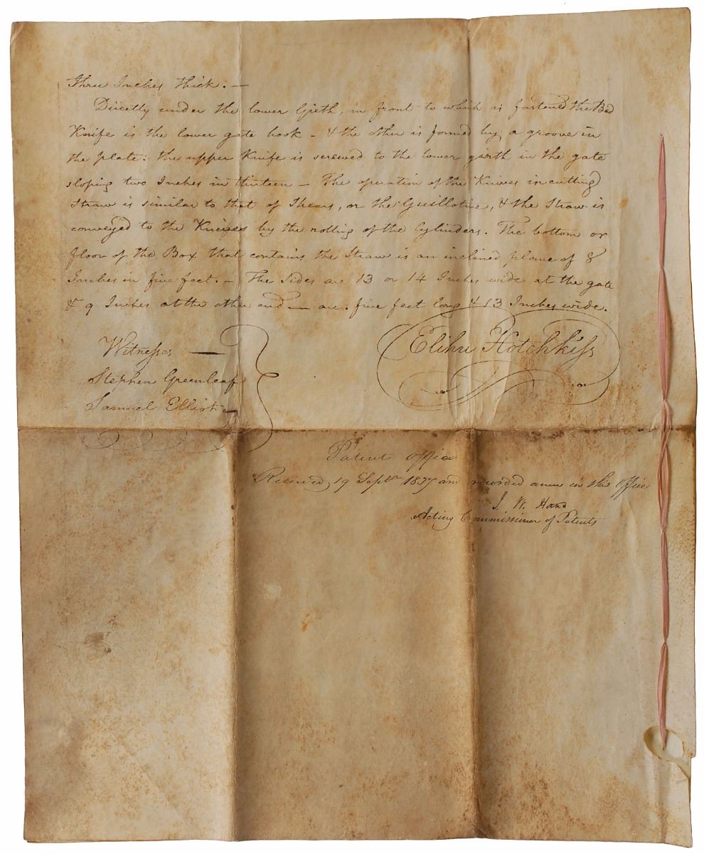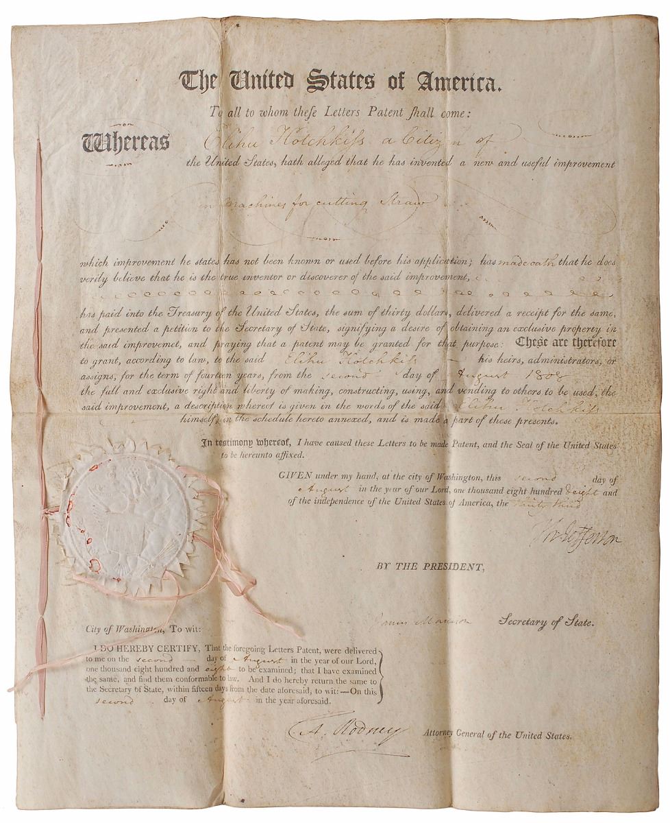 Highly desirable partly-printed vellum DS, signed “Th: Jefferson” as president and “James Madison” as secretary of state, two pages, 11.75 x 14.5, August 2, 1808. An official patent issued to “Elihu Hotchkiss, a Citizen of the United States, [who] hath alleged that he has invented a new and useful improvement in machines for cutting Straw.” Neatly signed at the conclusion by President Jefferson and Secretary of State Madison, as well as Attorney General C. A. Rodney. The embossed white paper seal and light pink ribbons to the left side remain intact. The second page, still attached by the binding ribbon, contains Hotchkiss’s own detailed description of the straw-cutting machine. In very good condition, with scattered soiling not affecting overall visual appeal.