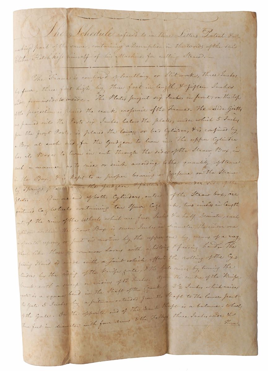 Unlike many inventions, Hotchkiss’s straw cutting machine actually met with some success. In 1815 the Massachusetts Society for Promoting Agriculture awarded him a $75 prize for his ‘machine for cutting straw and corn-stalks,’ and recommended it as ’the best and cheapest machine for the purpose known in this country.’ References to the ‘Hotchkiss Straw Cutter’ appear in several different agricultural periodicals through the 1800s, nearly all praising the machine for its efficiency and ease of use. President Jefferson was an ardent promoter of agricultural techniques and innovation, making this an especially nice association. According to ABPC, this is only the third Jefferson patent to be offered since 2003; in this attractive condition, it is an especially desirable example.