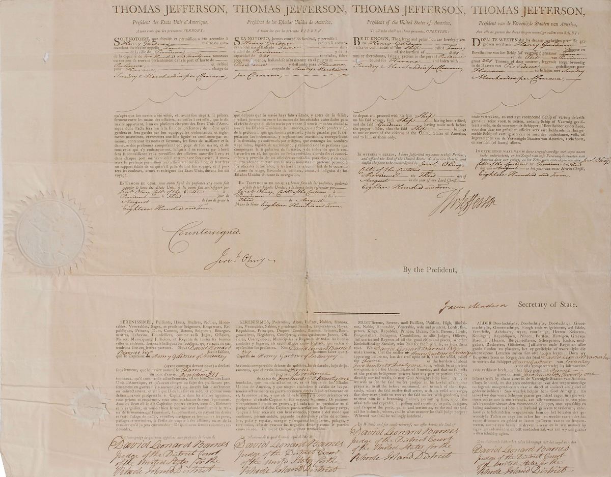 Partly-printed DS, signed “Th: Jefferson” as president and “James Madison” as secretary of state, one page, 20.75 x 16.25, August 3, 1804. A four-language ship’s papers issued to “Henry Gardner master or commander of the Ship called Fame…lying at present in the port of Providence bound for Havana and laden with Sundry Merchandise for Clearance.” Prominently signed in the center by President Jefferson and countersigned below by Secretary of State Madison. The white paper seal affixed to the left side remains fully intact. In very good to fine condition, with small areas of paper loss, intersecting folds, light overall toning; both signatures are choice exemplars, with the Jefferson being especially large, crisp, and bold. Exemplary signatures on this sought-after presidential format.