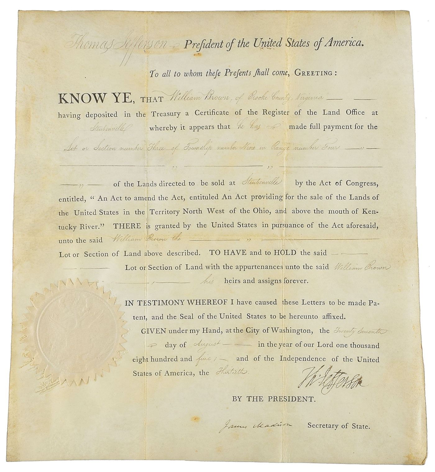 Partly-printed vellum DS, signed “Th: Jefferson” as president and “James Madison” as secretary of state, one page, 11.5 x 12.5, August 27, 1805. Fantastic land grant issued to William Brown of Brooke County, Virginia, for "the Lot or Section number Three of Township number Nine in Range number Four of the Lands directed to be sold at Steubenville." Boldly and prominently signed at the conclusion by President Jefferson, and countersigned by Secretary of State Madison. The crisply embossed paper seal affixed to the lower left remains fully intact. In fine condition, with one tiny hole, light soiling, and light toning along intersecting folds. A beautiful dual-signed document from two of America's most significant founding fathers.