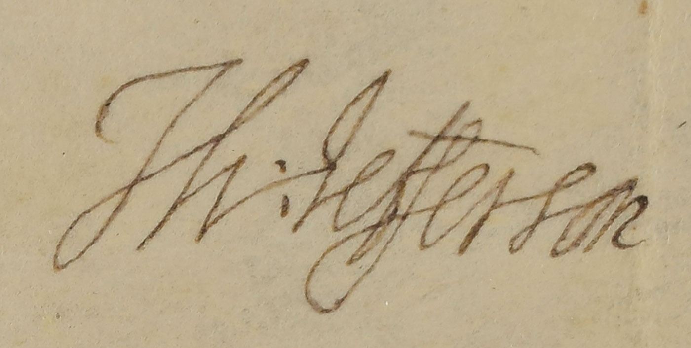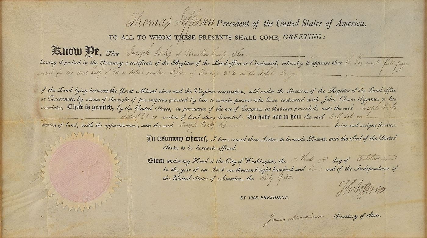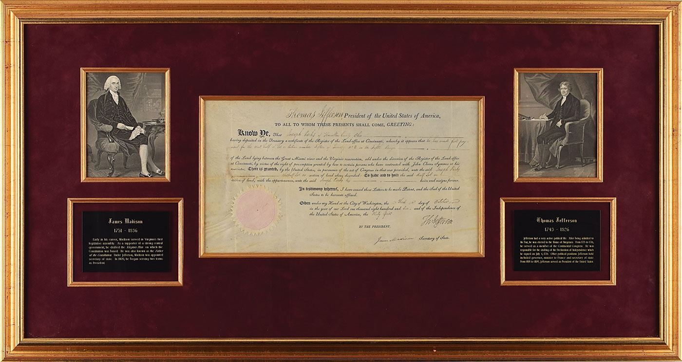 Partly-printed vellum DS as president, signed “Th: Jefferson” as president and “James Madison” as secretary of state, one page, 15.75 x 8.75, October 3, 1806. President Jefferson grants Joseph Parks of Hamilton County, Ohio, a tract of land in "the West half of Lot or Section number Fifteen of Township No. 2 in the Fifth Range of the Land lying between the Great Miami river and the Virginia reservation, sold under the direction of the Register of the Land-office at Cincinnati." Signed neatly at the conclusion by President Jefferson, and countersigned by Secretary of State Madison. The white paper seal remains affixed to lower left. Handsomely matted and framed with plaques and engravings to an overall size of 39.25 x 21. In fine condition.