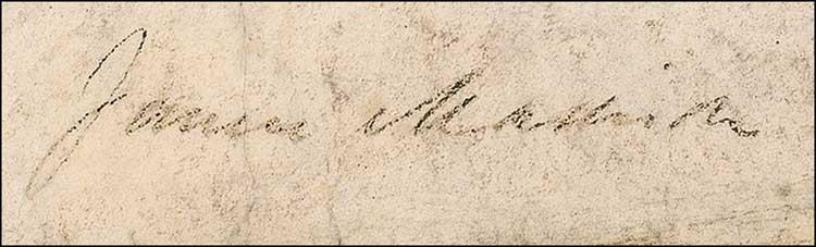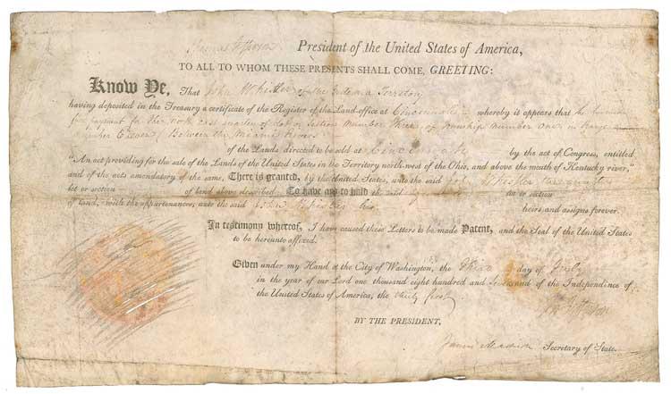 Partly-printed vellum DS, one page, 14.5 x 8.5, July 3, 1807. Land grant issued to John Whistler of the Indiana Territory for a parcel of land under an “Act of Congress entitled ‘An Act providing for the sale of the Lands of the United States in the territory north-west of the Ohio and above the mouth of the Kentucky River.’” Signed at the conclusion in ink by Thomas Jefferson, and countersigned by his Secretary of State James Madison. In fair condition, with trimmed edges, overall mild wrinkling and creasing, scattered light toning and moderate soiling, affecting legibility of both signatures, missing seal, scoring to seal area, several small pinholes of paper loss, and both signatures fairly light, but still mostly legible. Pre-certified John Reznikoff/PSA/DNA and RRAuction COA.