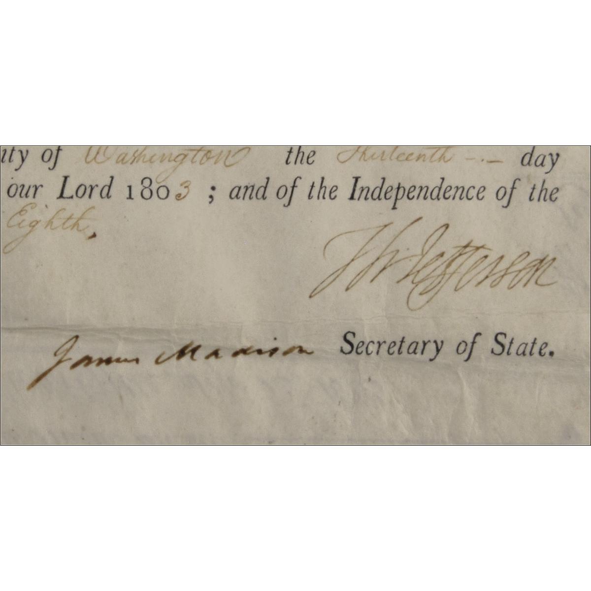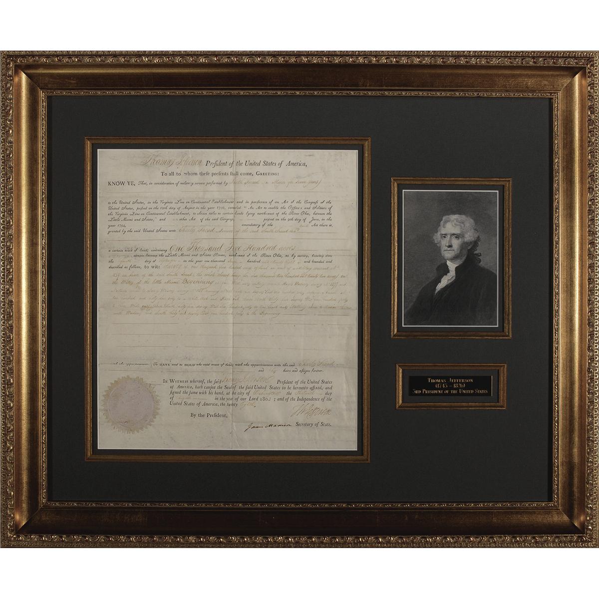 Partly-printed DS, signed “Th: Jefferson” as president and “James Madison” as secretary of state, one page, 13 x 15, August 13, 1803. A grant for a 1500-acre parcel of land, issued to Smith Snead, “a Major for seven years to the United States, in the Virginia Line on Continental Establishment” under the provisions of “An Act to enable the Officers and Soldiers of the Virginia Line on Continental Establishment to obtain titles to certain lands.” Archivally matted and handsomely framed with a portrait of Jefferson and a small name plaque to an overall size of 30.25 x 25. In very good to fine condition, with intersecting storage folds, some scattered light soiling and wrinkling, handwritten portions of document a shade or two light, but still legible, and some light show-through from docketing on reverse. Both signatures are clear and legible. The white paper seal is lightly toned and worn, but intact.